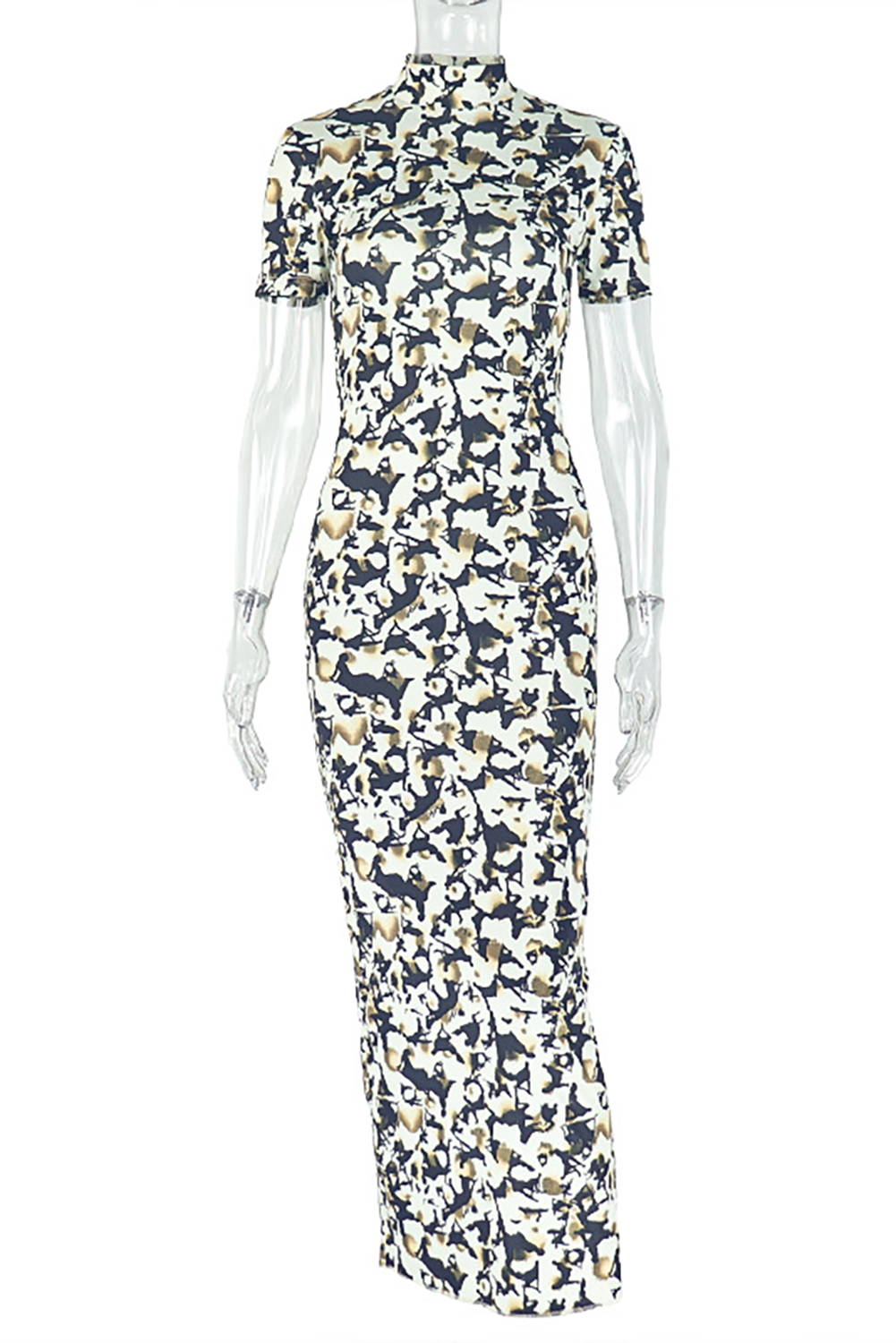 Abstract Print Stand Collar Short Sleeve Open Back Bodycon Midi Dresses-Beige