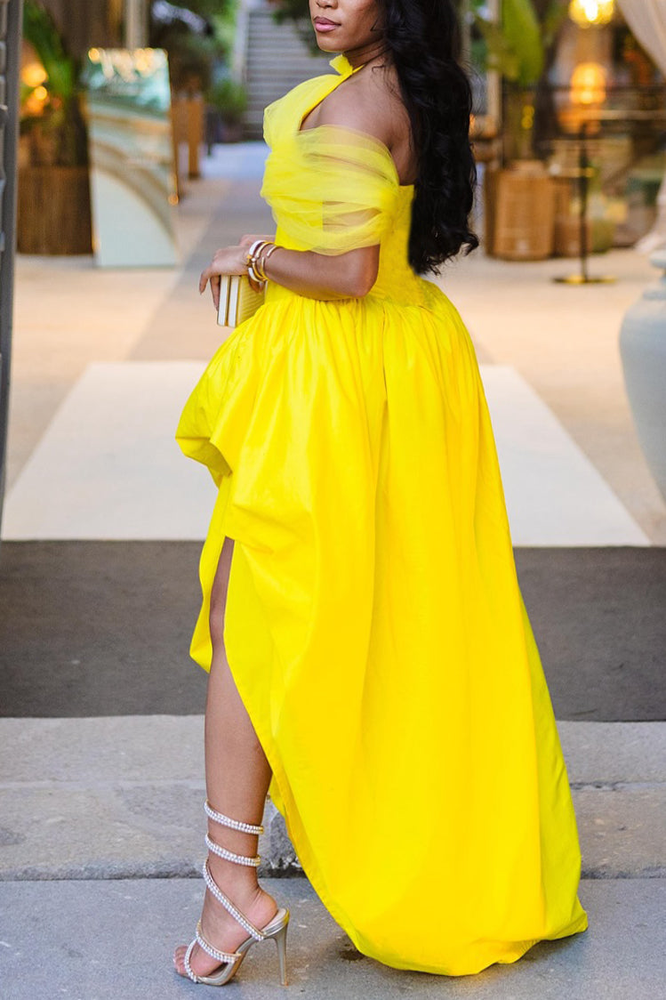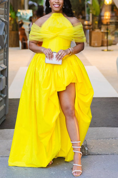 Bright Halterneck Tulle Irregular Pleated Hem Maxi Dress