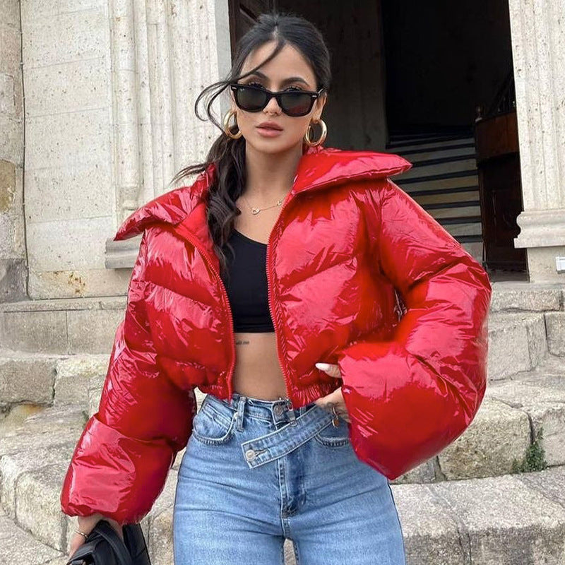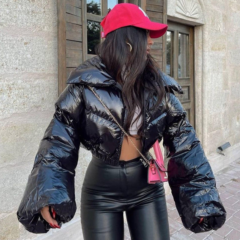 Autumn and Winter New Glossy PU Leather High Collar Super Long Sleeve Warm Thick Tops Coat