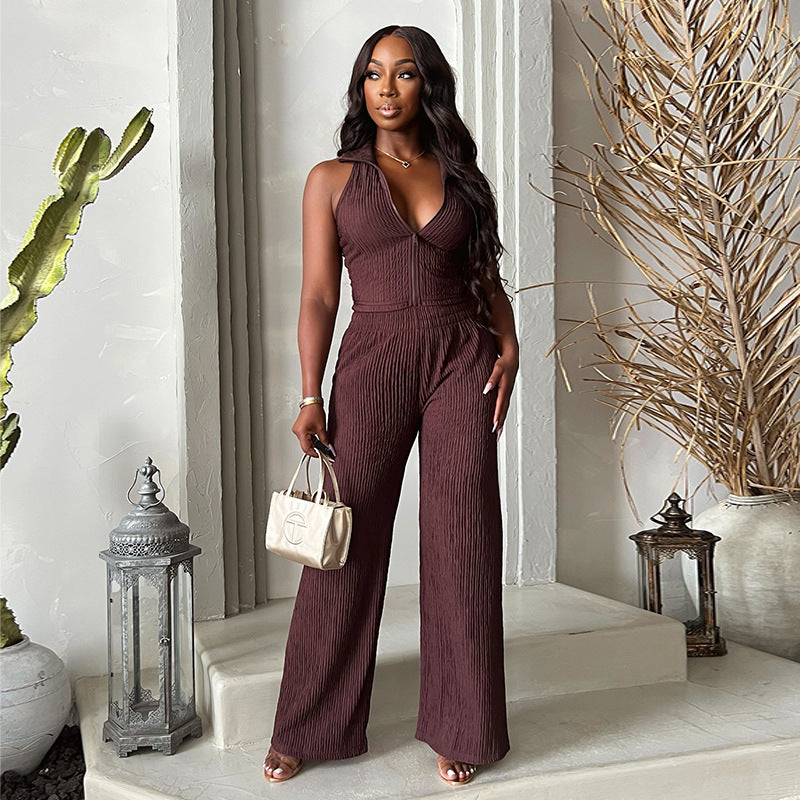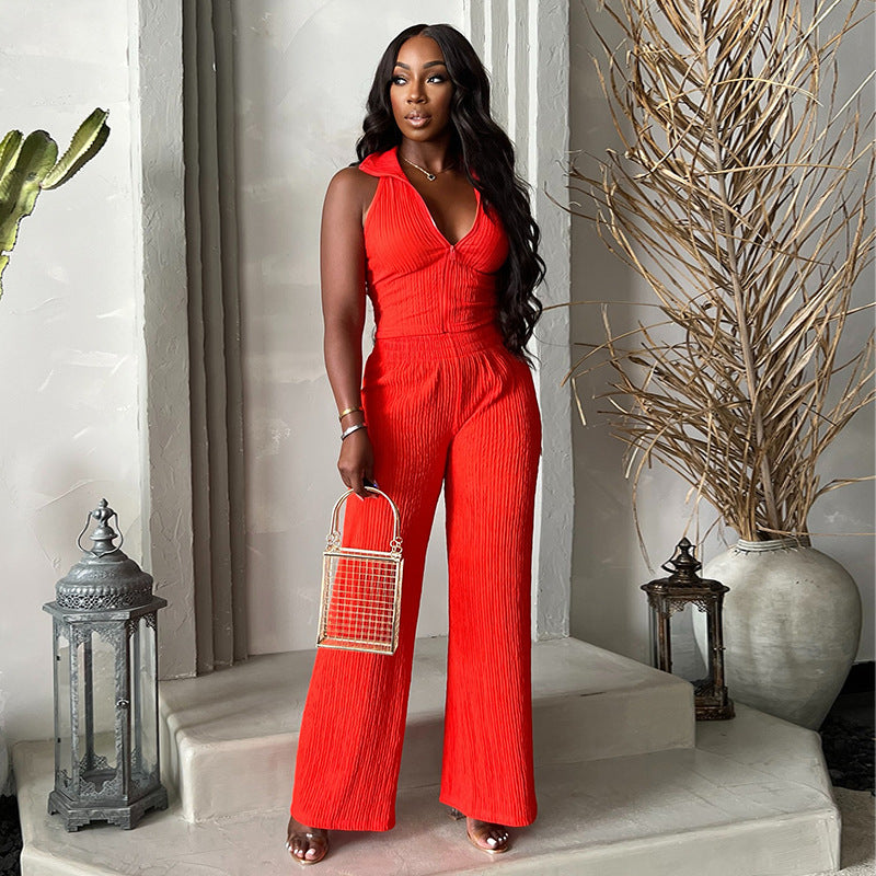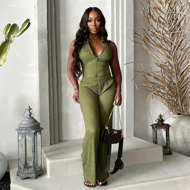 Autumn New Sweet Comely Turn-down Collar Sleeveless Vest High Waist Straight Pants Two-Piece Set