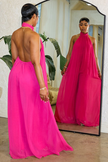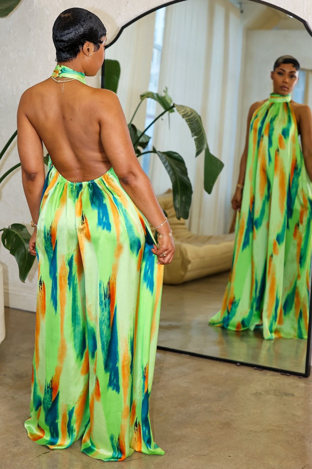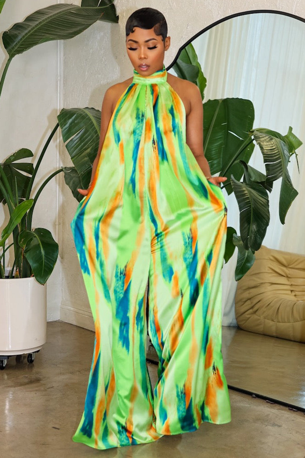 Backless Tie Dye Print Vacay Oversize Wide Leg Jumpsuit-Green [Pre Order]