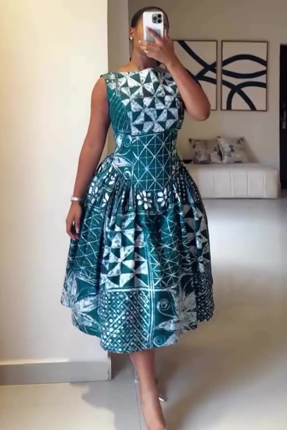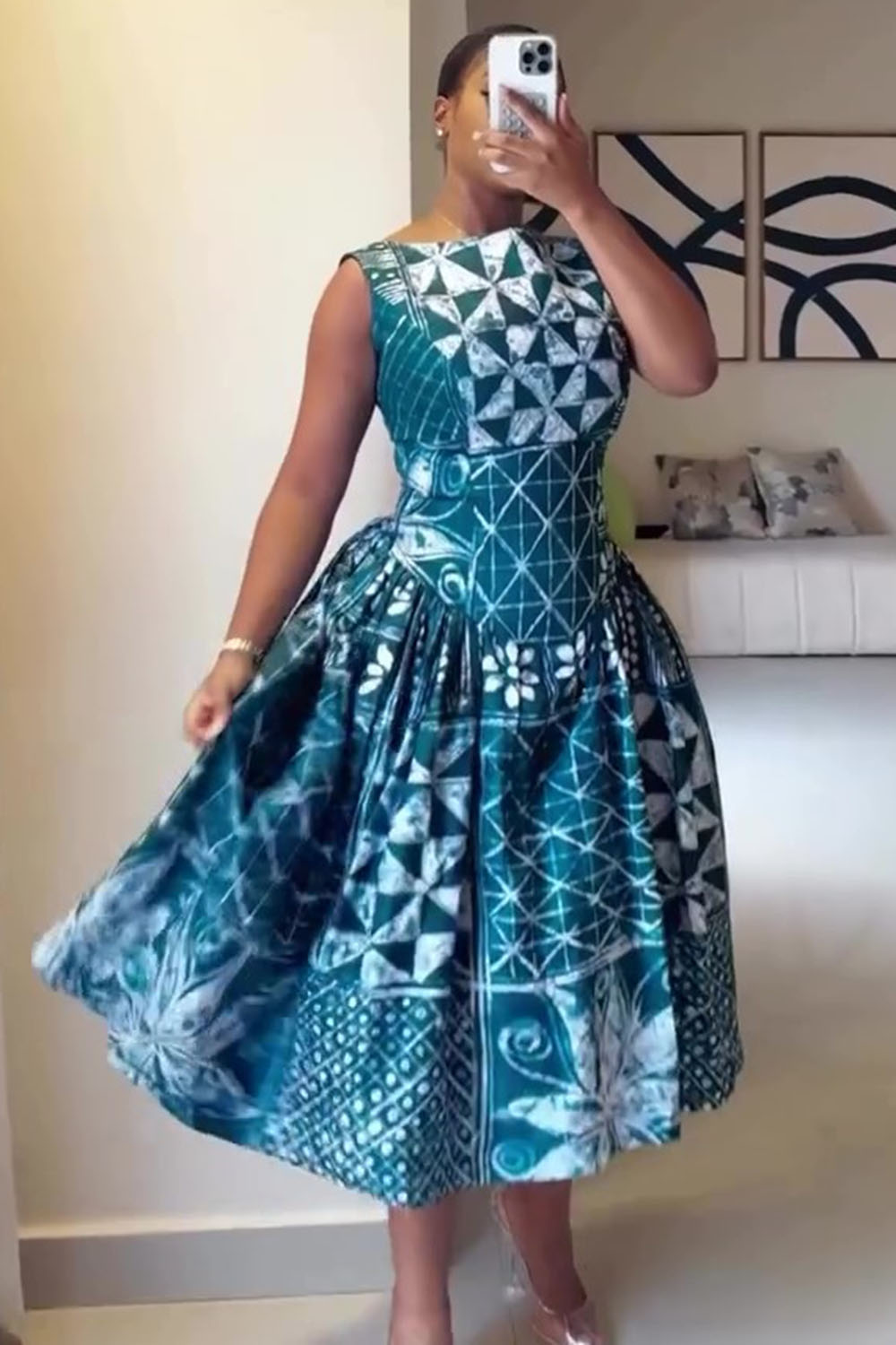 Boat Neck Sleeveless Boho Print Basque Waist Midi Dresses-Teal [Pre Order]