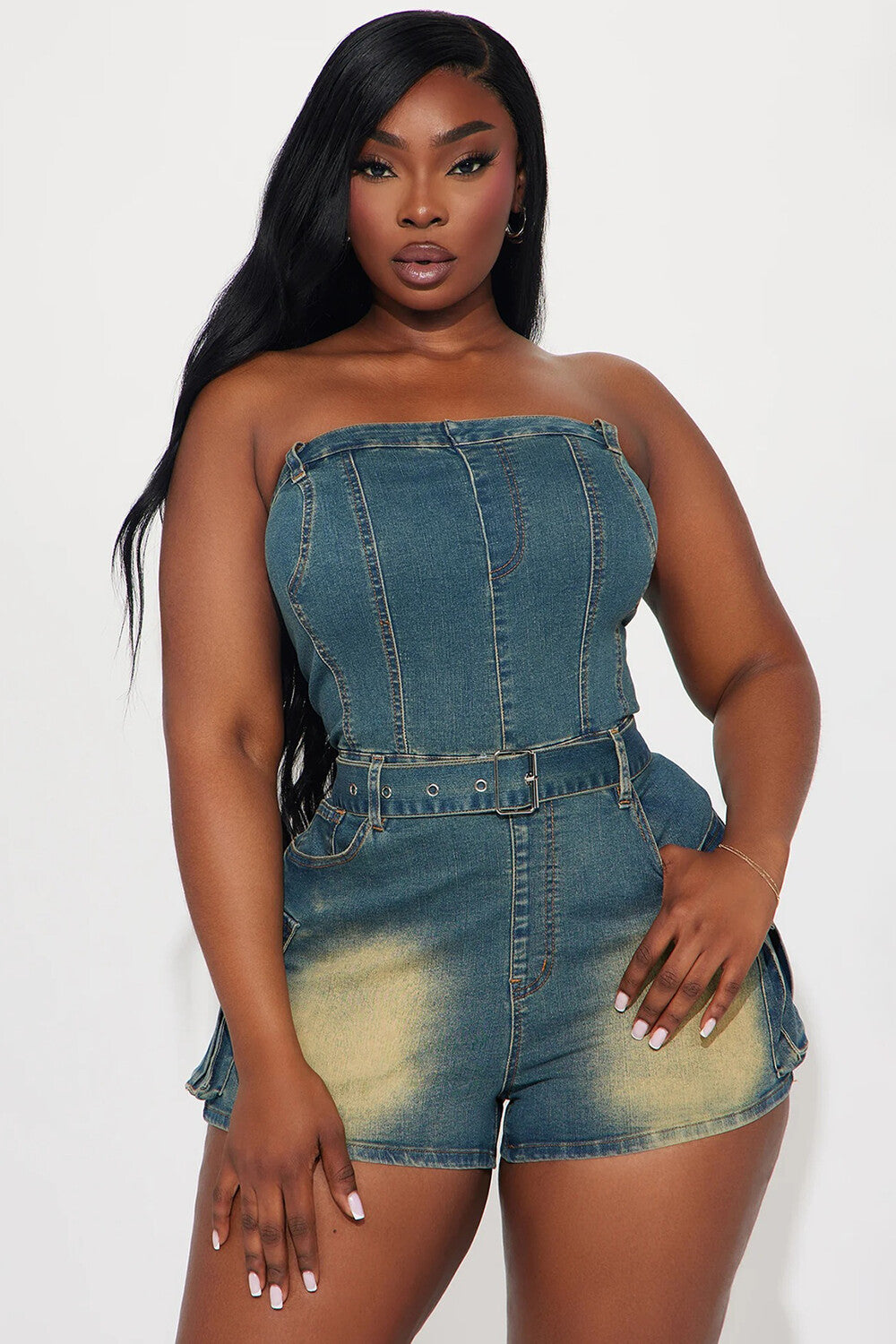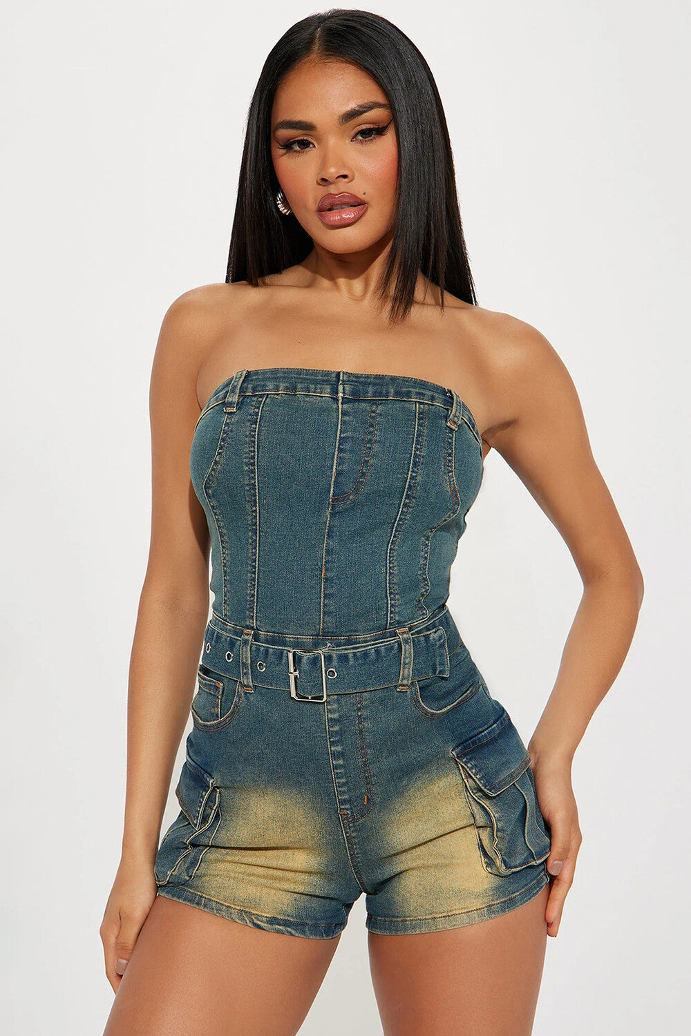 Boat Neck Strapless Belted Pockets Denim Casual Playsuit Romper-Blue