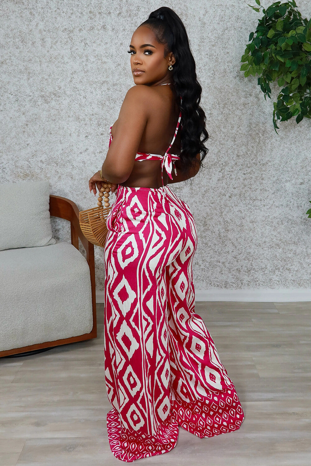 Boho Placement Print Halter Backless Vacay Wide Leg Jumpsuit-Red [Pre Order]
