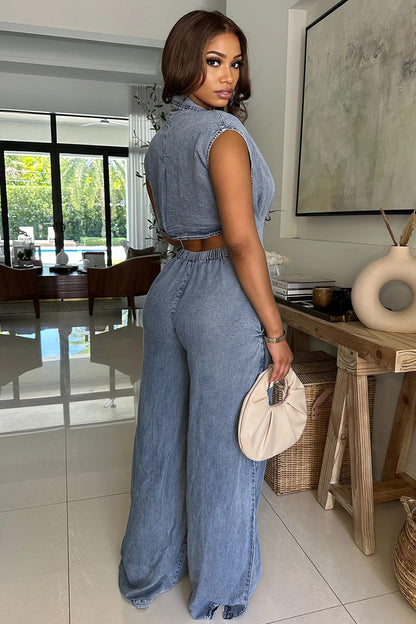 Button Up Cinched Cutout Washed Denim Wide Leg Jumpsuit-Blue [Pre Order]