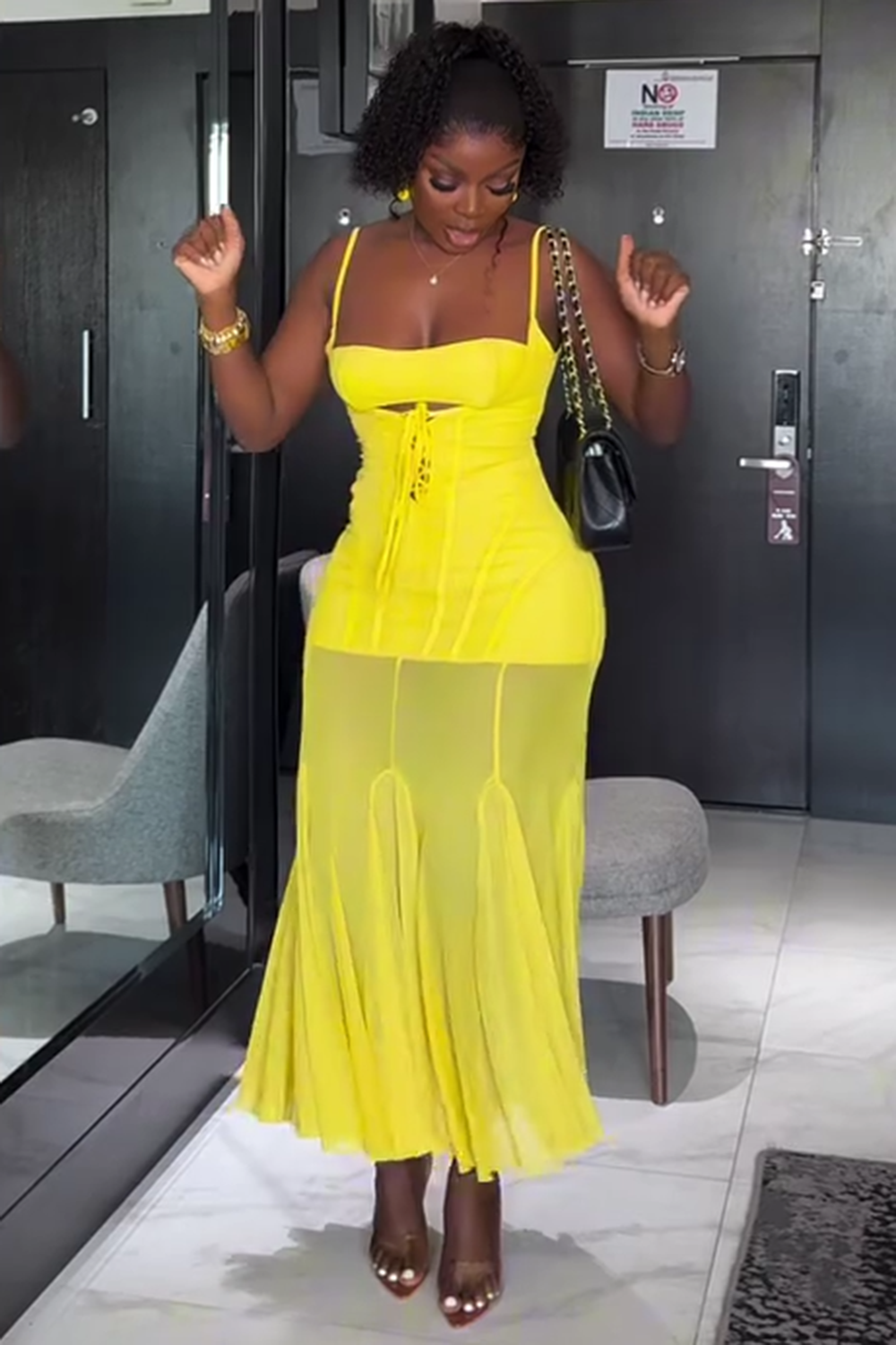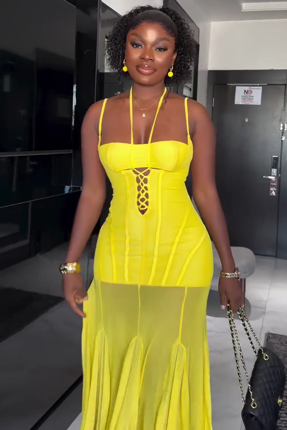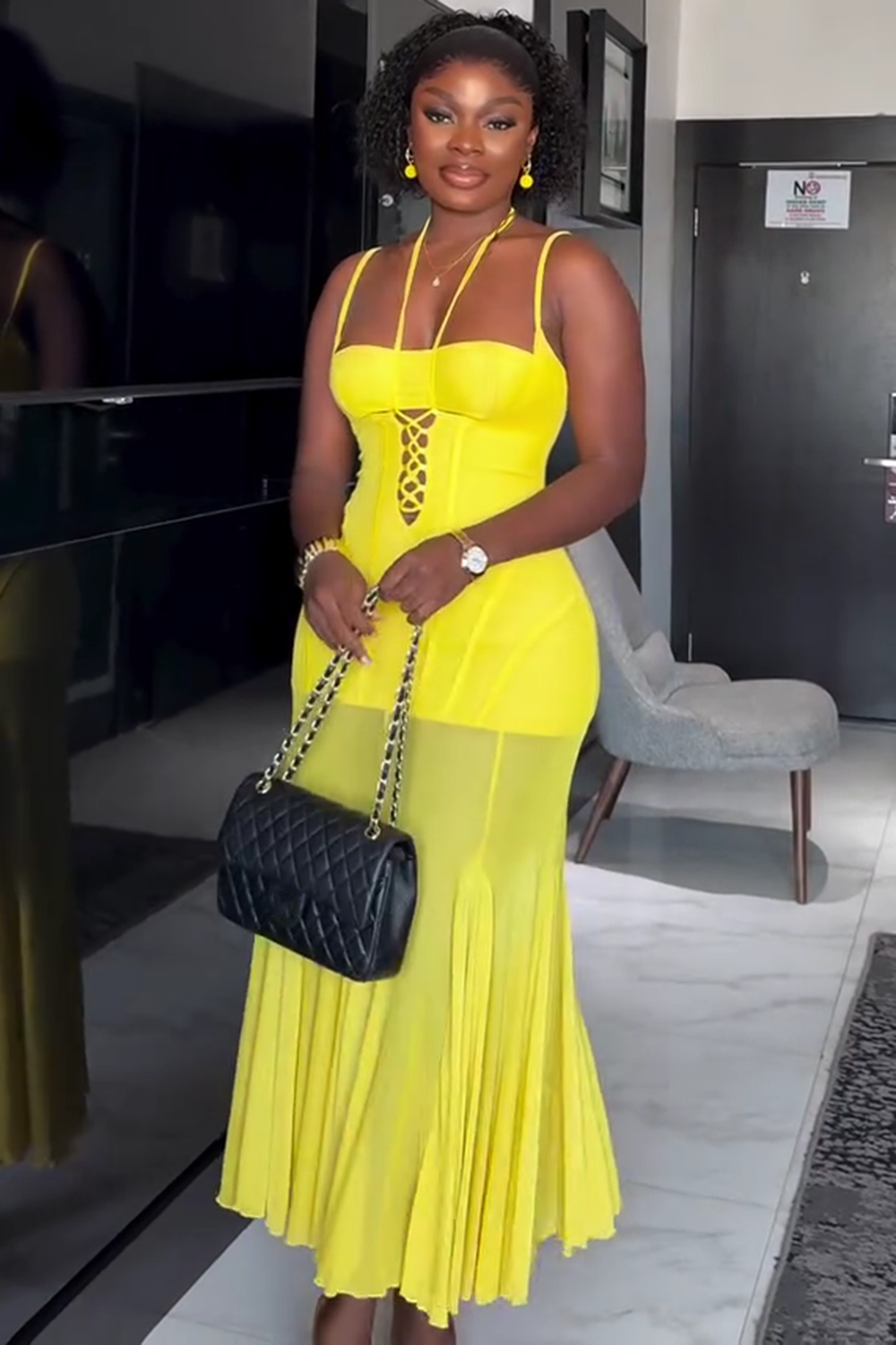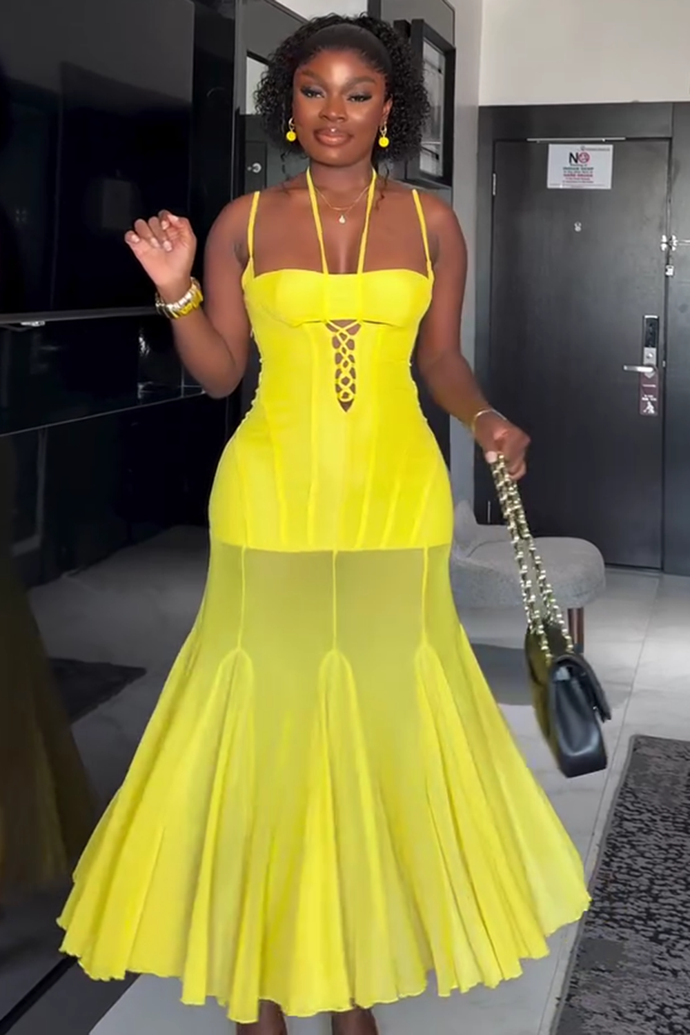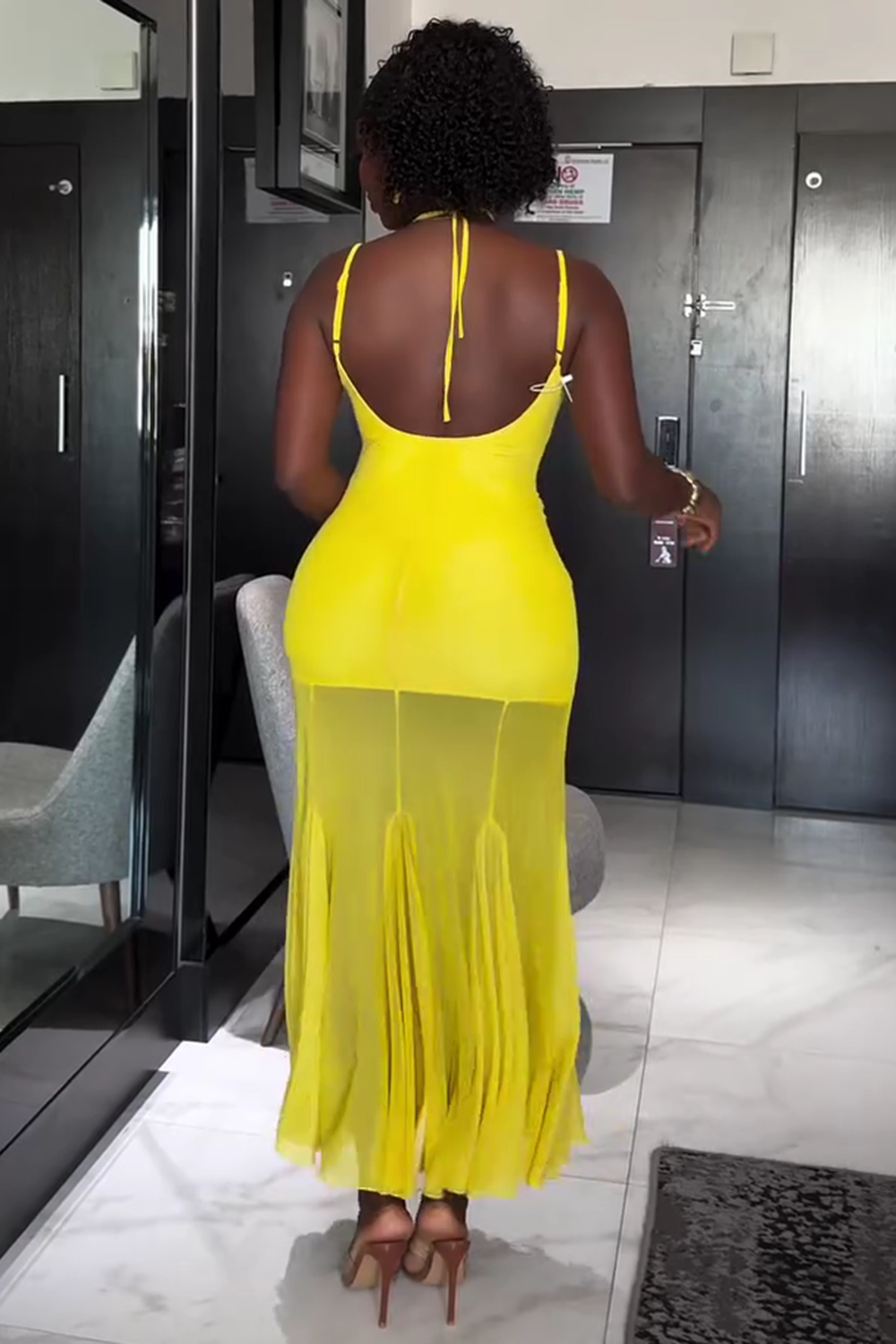 Cami Halter Lace-Up Godet Mesh Hem Party Maxi Dresses-Yellow [Pre Order]