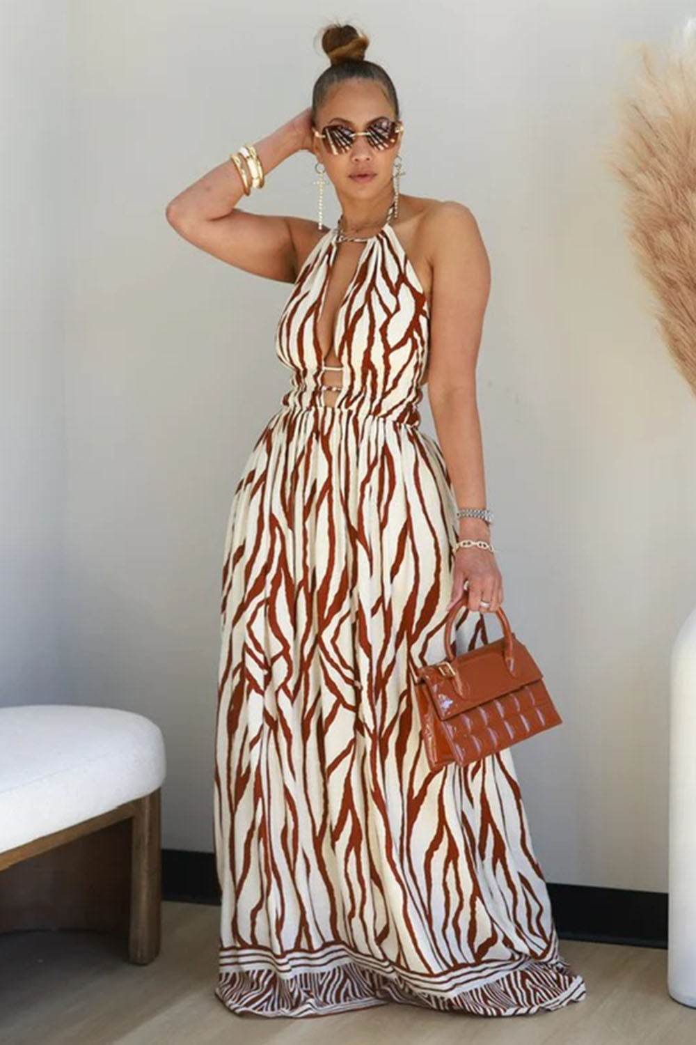 Deep V Halter Backless Boho Print Vacation Maxi Dresses-Brown