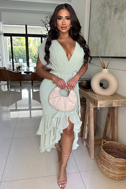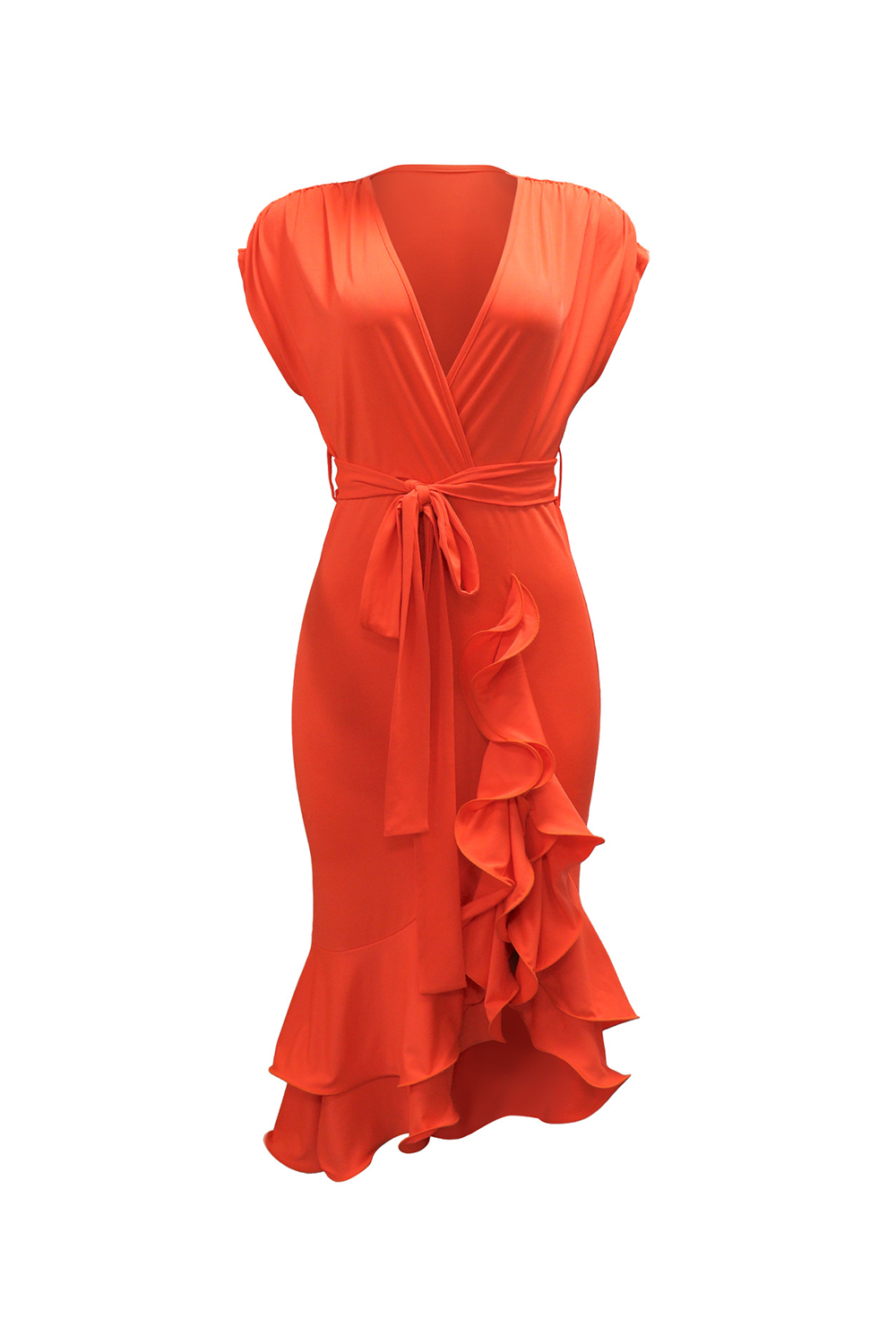 Deep V Neck Short Sleeve Tie Belt Ruffled Solid Color Midi Dresses-Orange