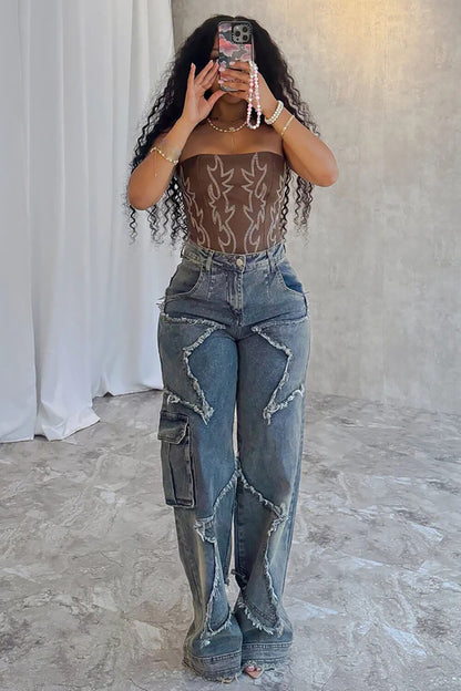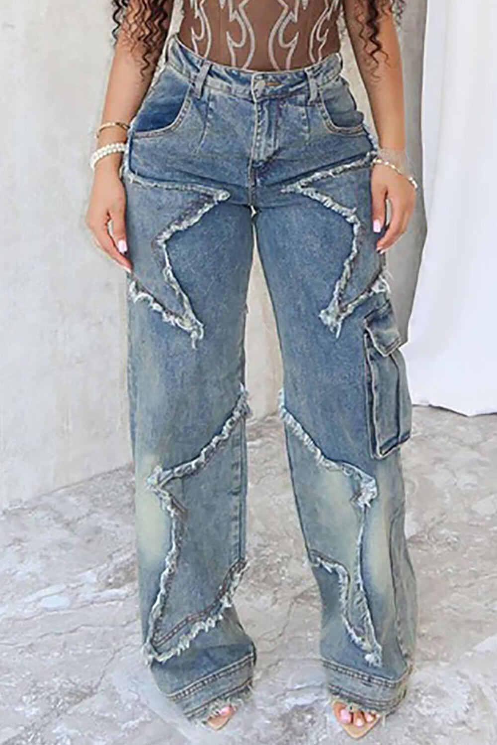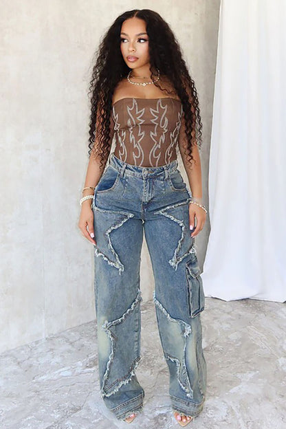 Denim Star Pattern Raw Edge High Waist Straight Leg Jeans-Blue