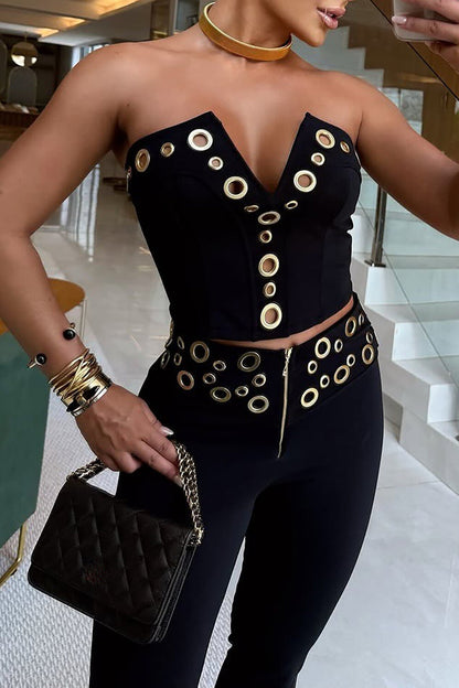 Eyelet Decor V Neckline Strapless Crop Top High Waist Pants 2pcs Set-Burgundy