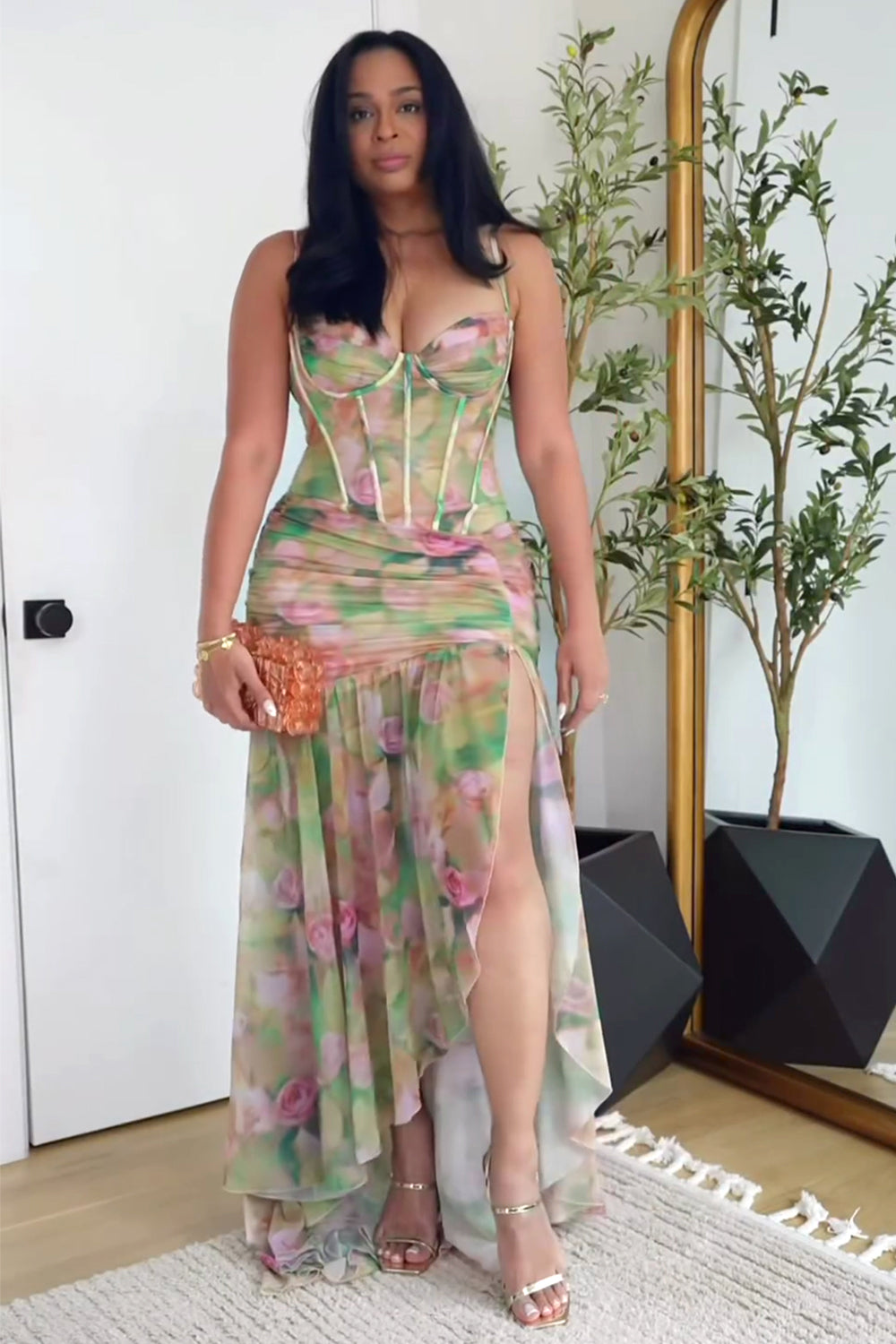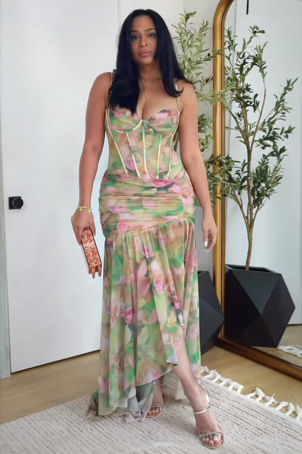 Floral Print Corset Ruched Slit Party Cami Maxi Dresses-Green [Pre Order]