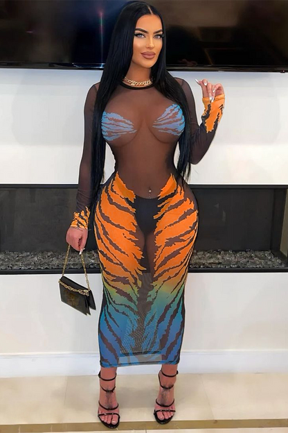 Gradient Color Animal Print Long Sleeve See Through Party Midi Dresses-Pink