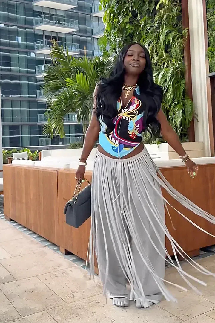 Versatile and edgy, the grey loose fringe Pants adds a dynamic and modern practical element to your wardrobe. Designed with a loose silhouette, this pants features removable fringe panels that can be adjusted to suit your personal style. The elastic waistband ensures all-day comfort, while the slanted side pockets and leather patch on the back add practical details without losing refinement.