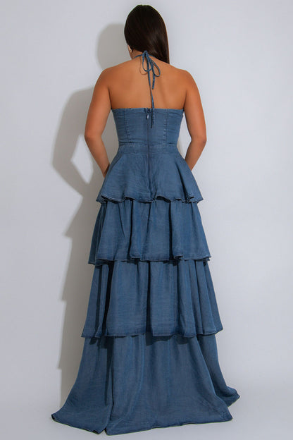 Halter Gathered Cutout Layered Denim Vacation Maxi Dresses-Blue [Pre Order]