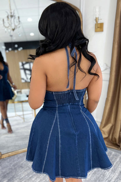 Halter V Neck Backless Godets A-Line Denim Mini Dresses-Blue