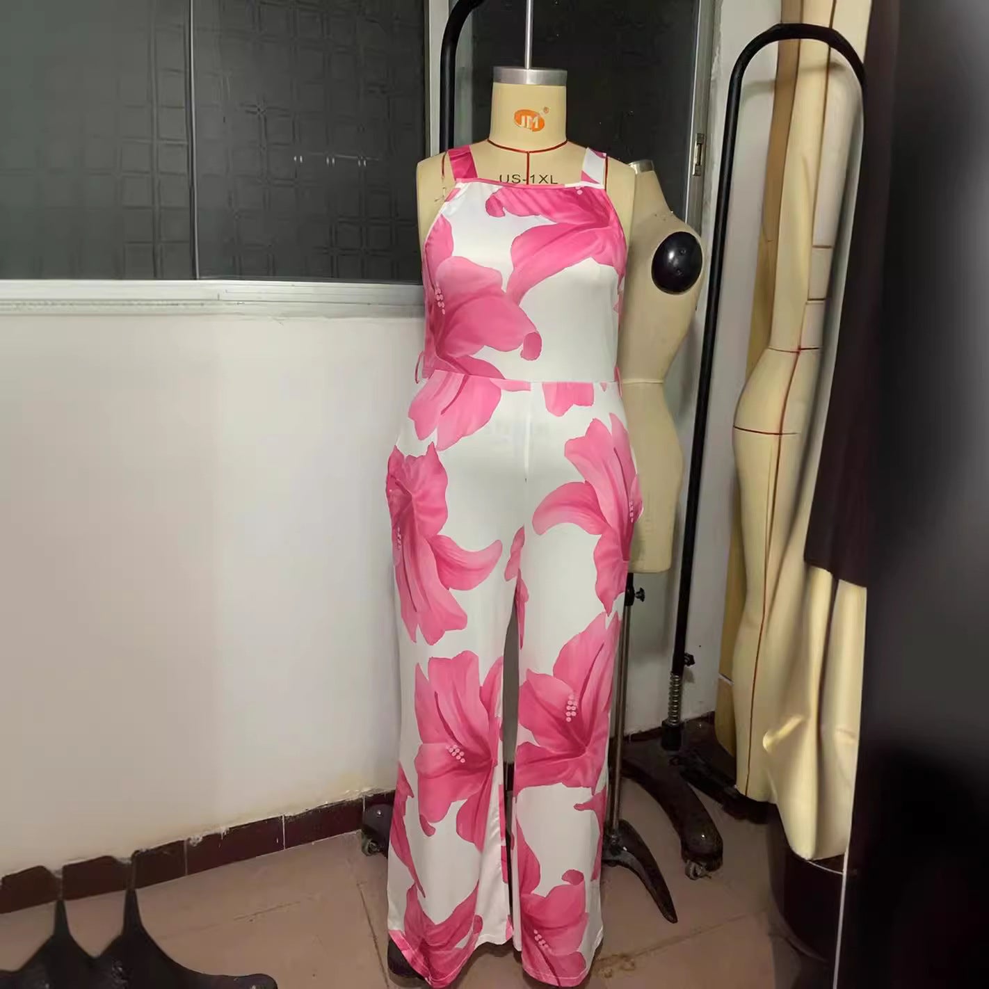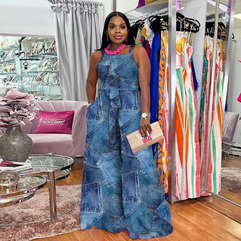 Hot-Sale Women's Clothing Casual Fashion Printing Belt Sling Pocket One-Piece Wide-Leg Pants