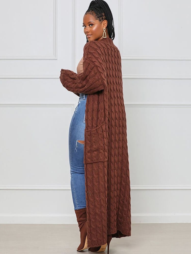 Feature: Knit. ribbed. solid color. long sleeve. bodycon. cardigan. long coats. pockets.