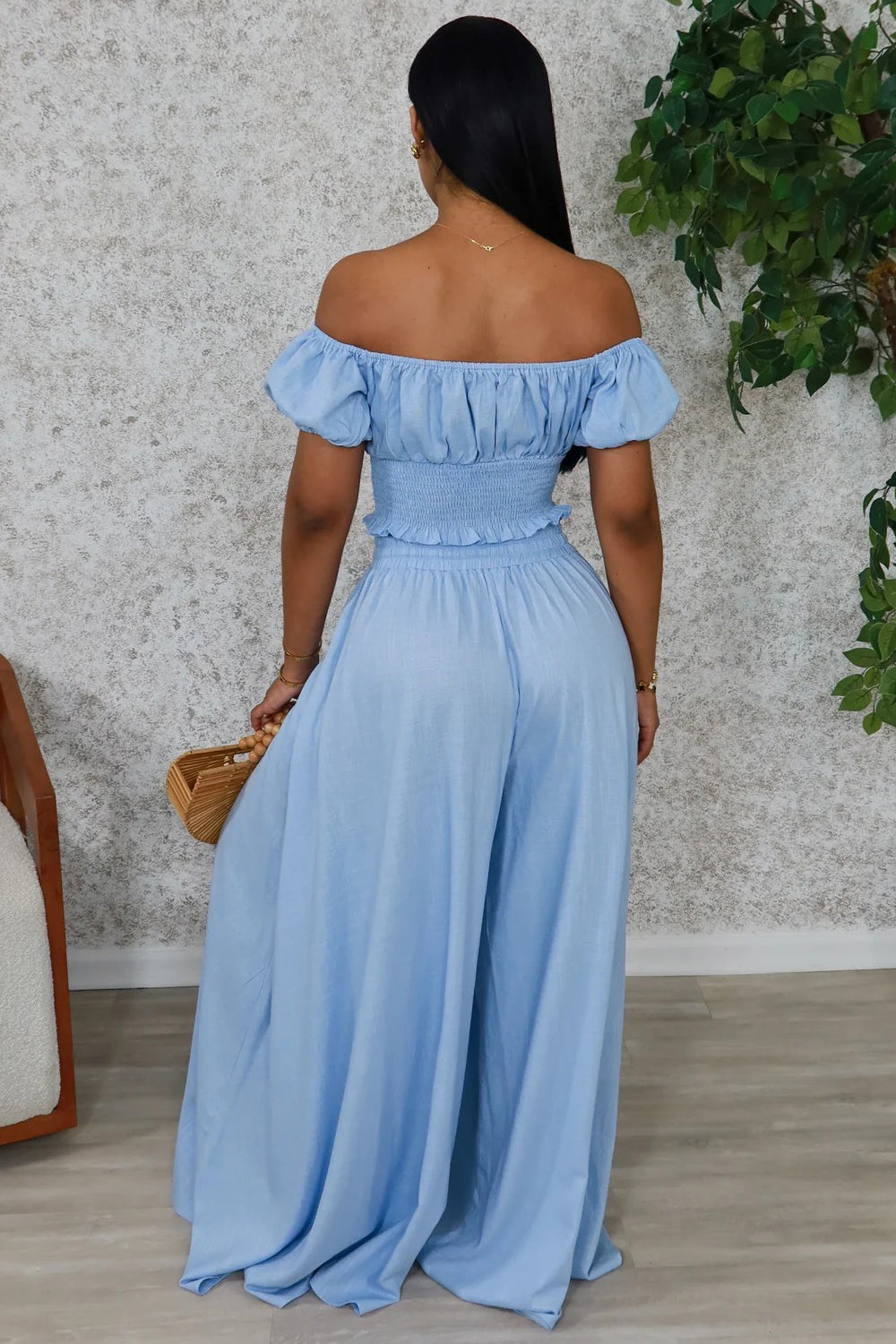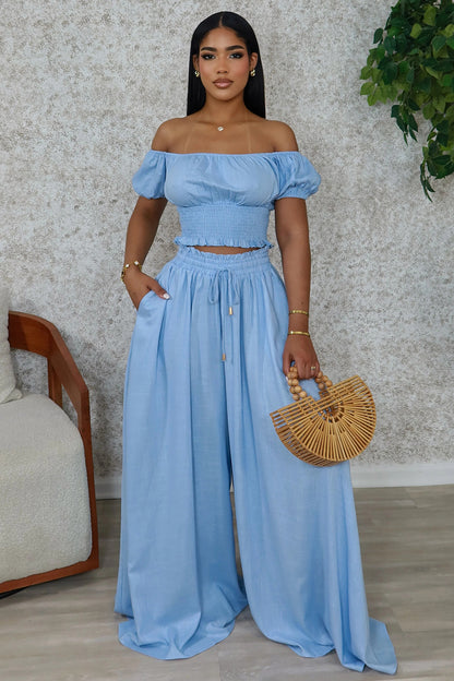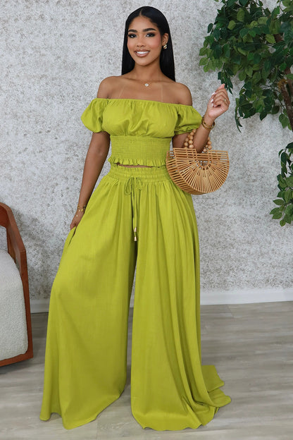 Off Shoulder Puff Sleeve Ruched Top Wide Leg Pants 2pcs Set-Green [Pre Order]