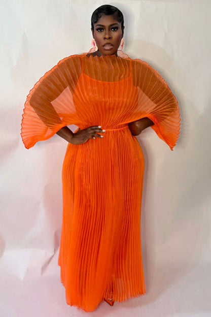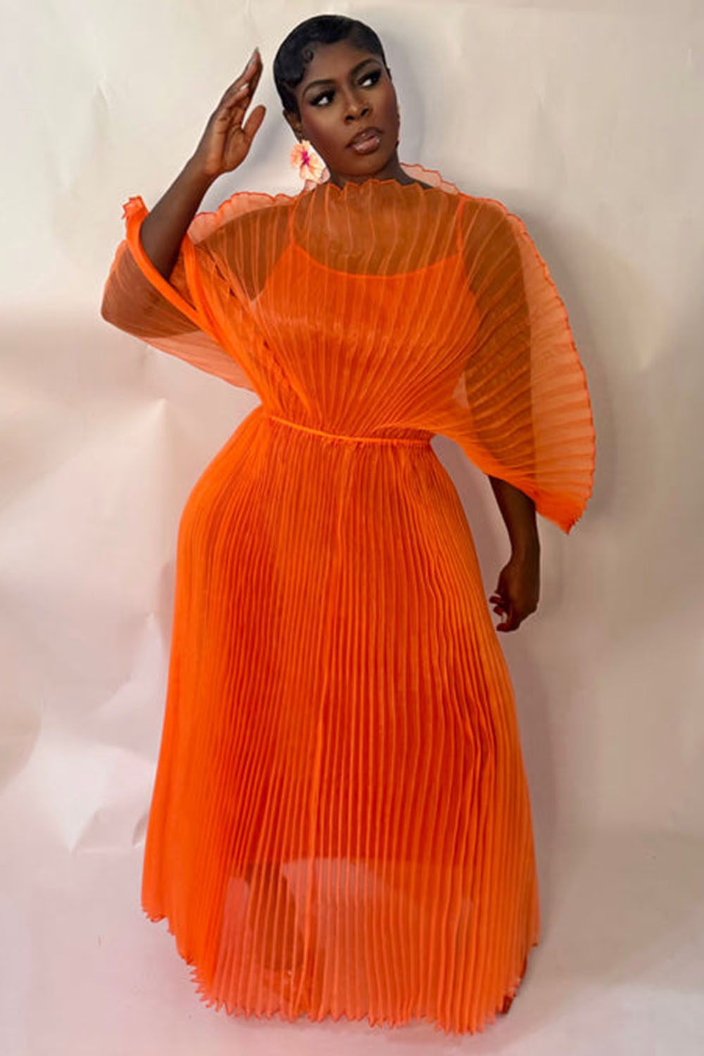 Pleated Mesh Layered Bat-Wing Sleeve Cami Maxi Dresses-Orange [Pre Order]