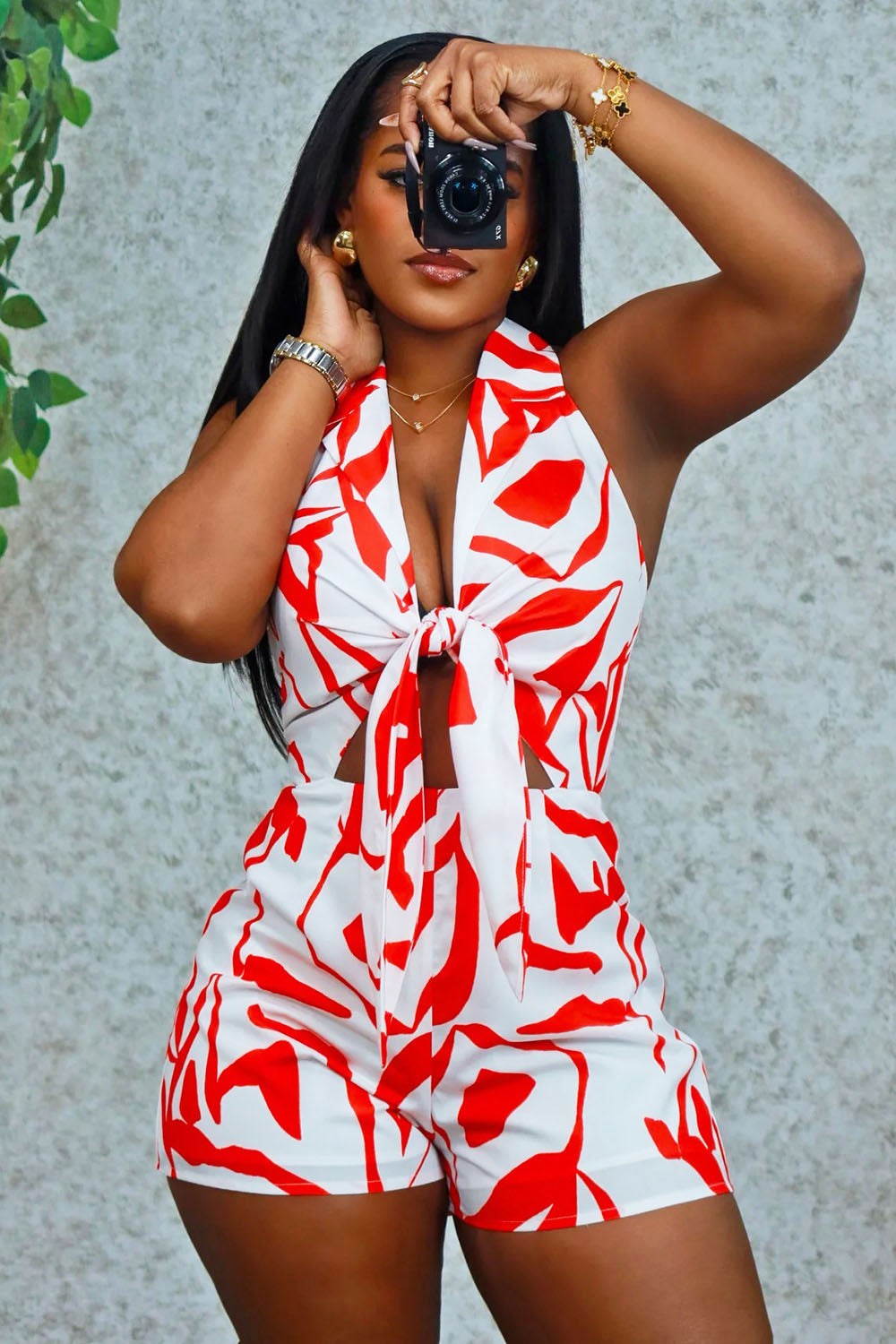 Print Halter Backless Knotted Top Shorts Vacation 2pcs Set-Orange