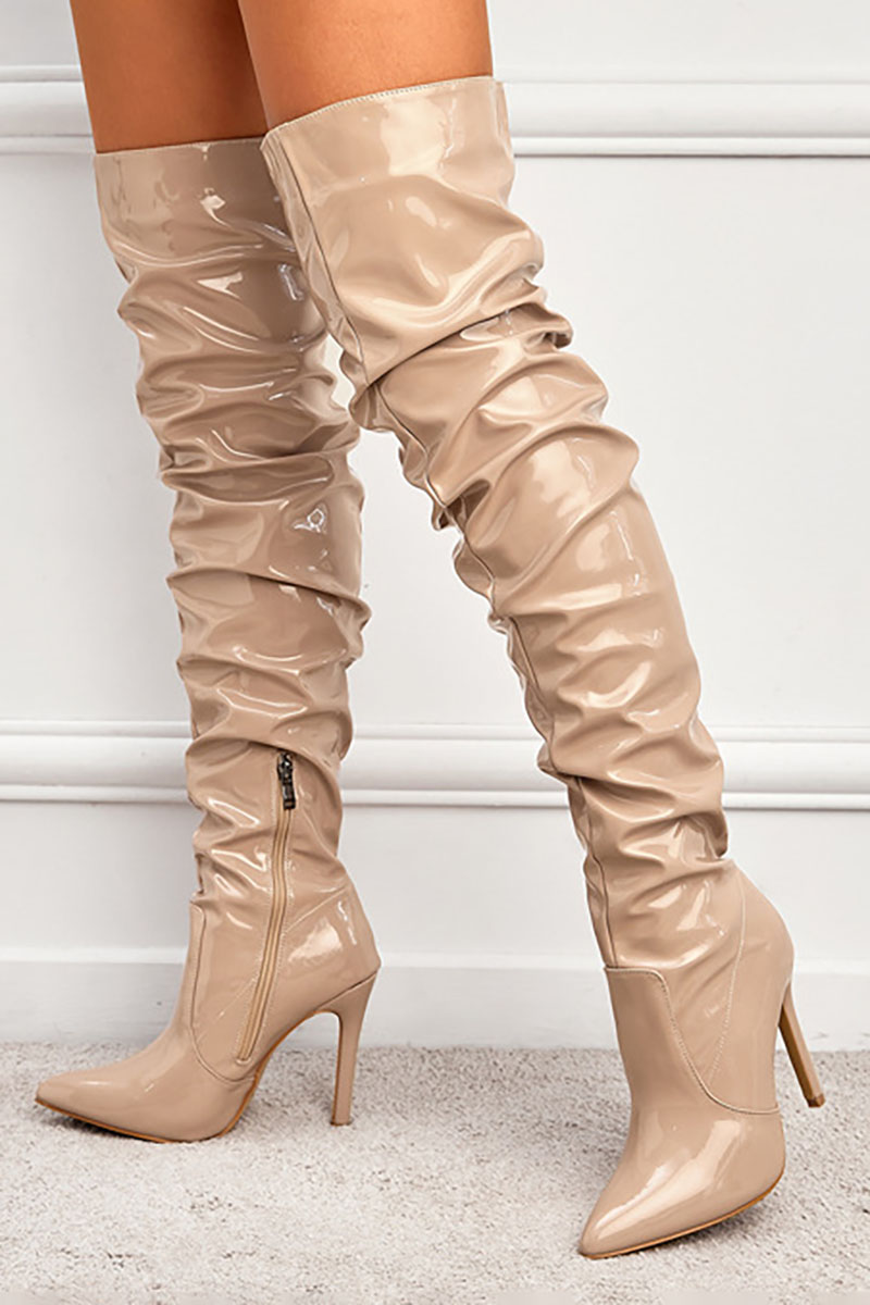 PU Leather Pointy Toe Ruched Thigh-High Boots-Black