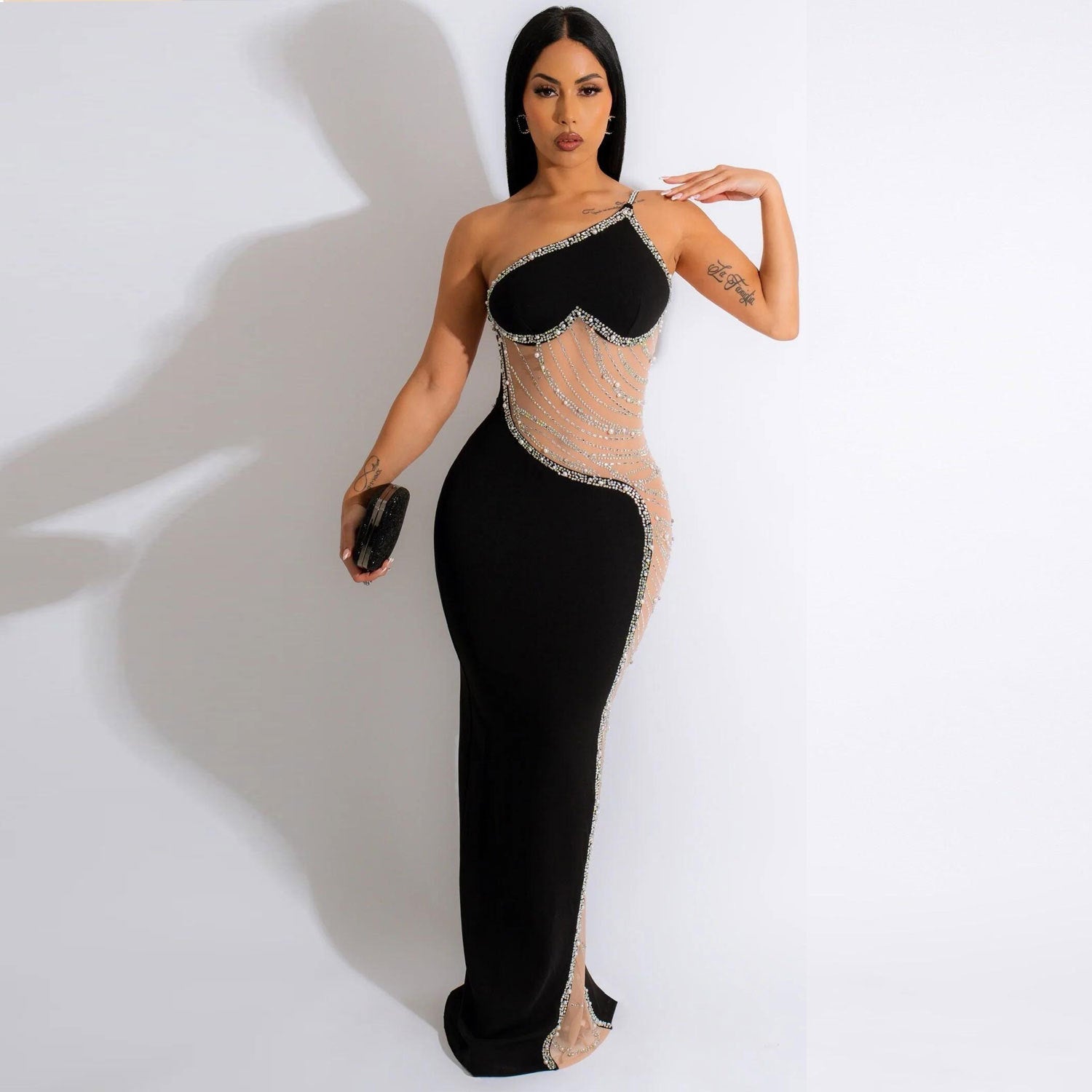 Features:Sleeveless. rhinestone. mesh. patchwork. see-through. one-shoulder. sexy. maxi dresses.
