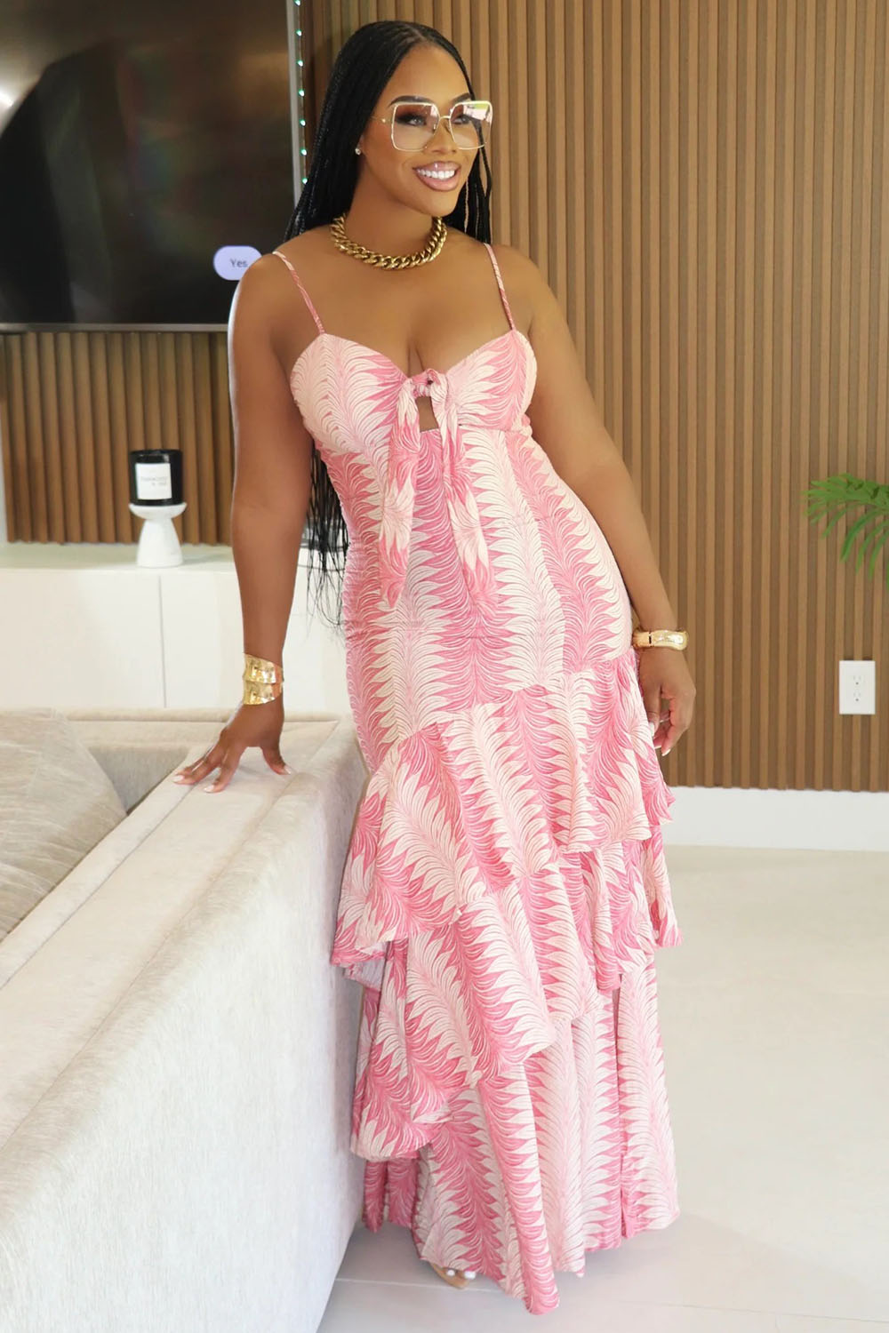 Ribbon Layered Hem Leaf Print Vacation Cami Maxi Dresses-Pink [Pre Order]