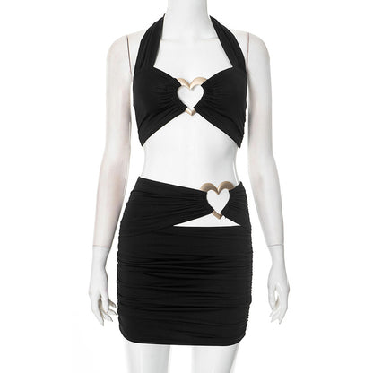Sexy Hot Girl Halter Love Metal Buckle Hollow out Top and Skirt Two-Piece Suit
