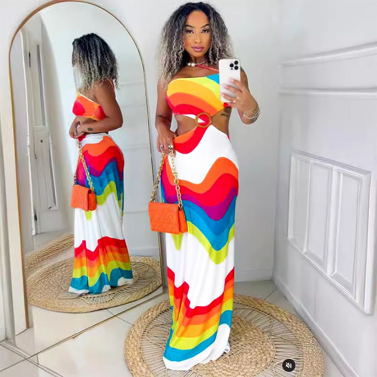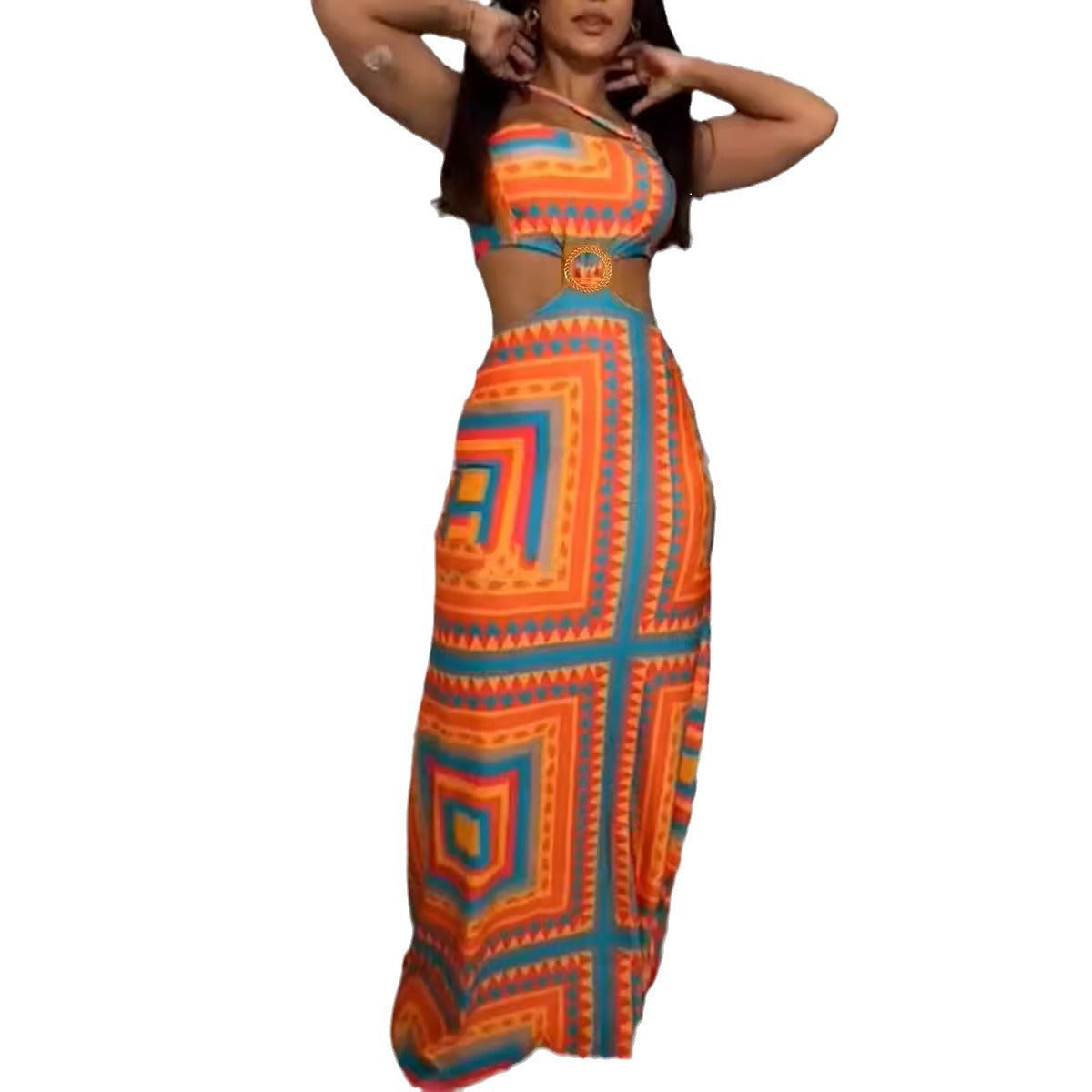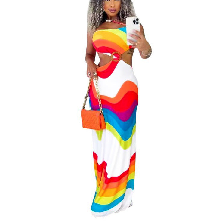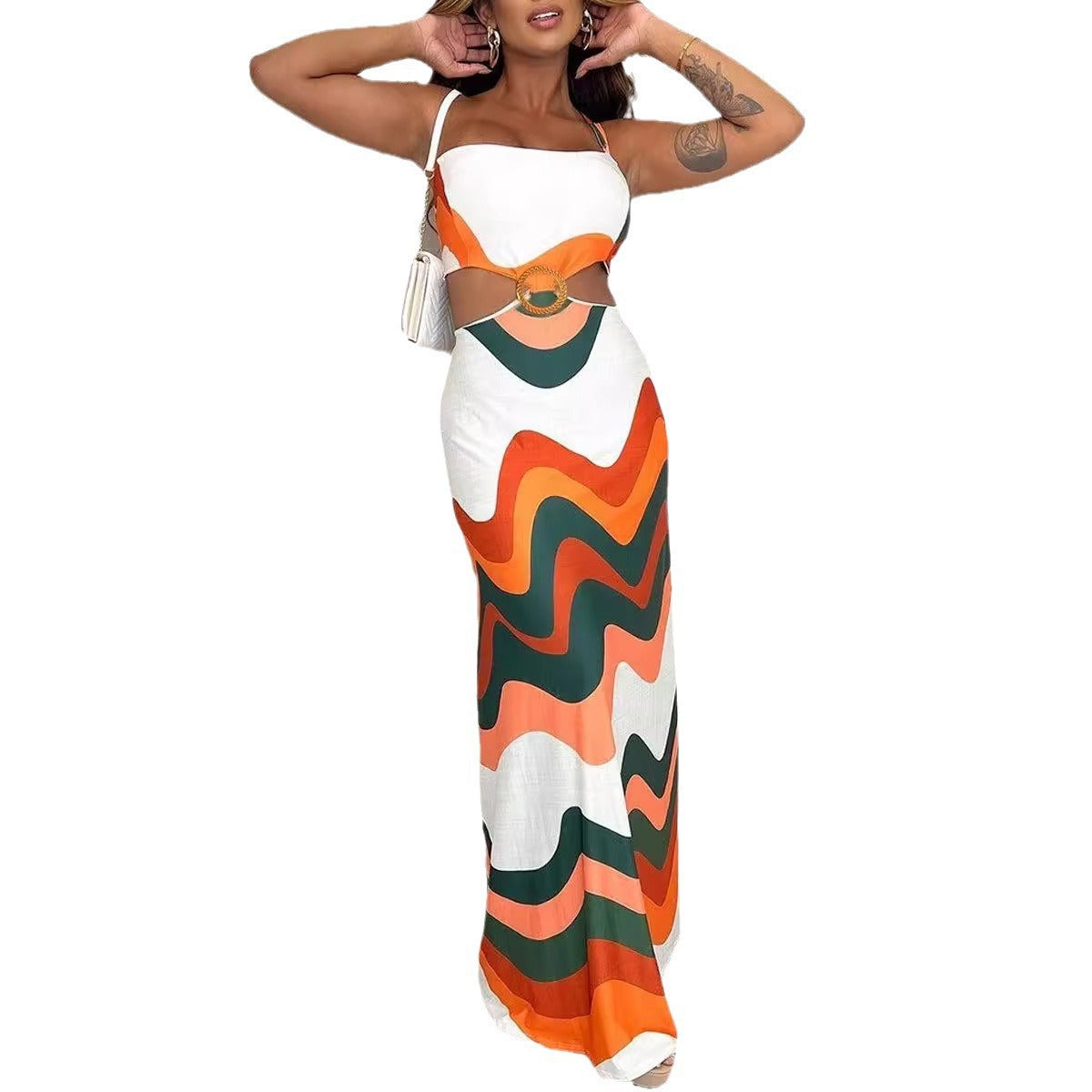 Sexy Print Stitched Backless Hollow Elastic Halter Maxi Dress