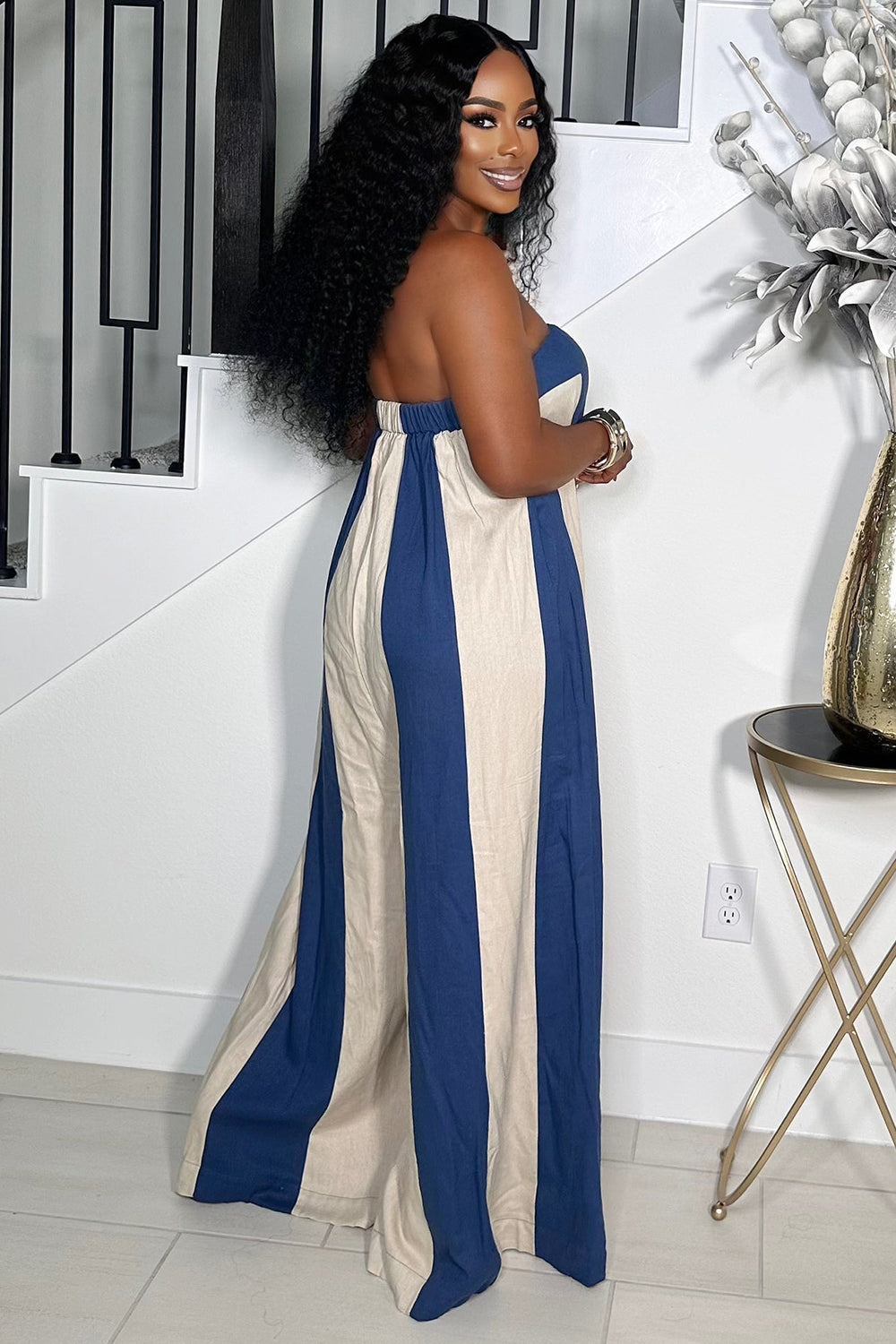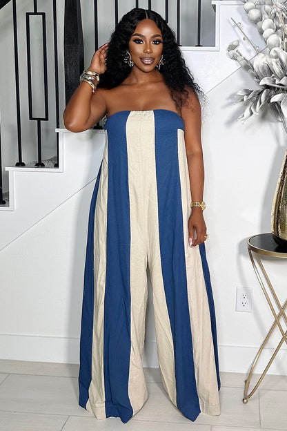 Strapless Colorblock Stripe Loose-Fit Wide Leg Jumpsuit-Blue [Pre Order]