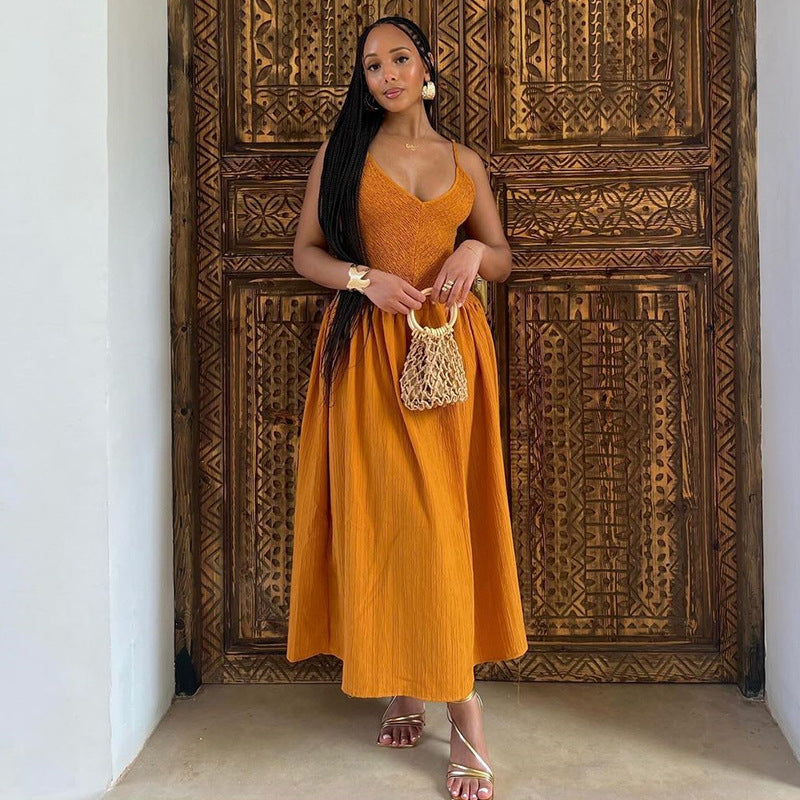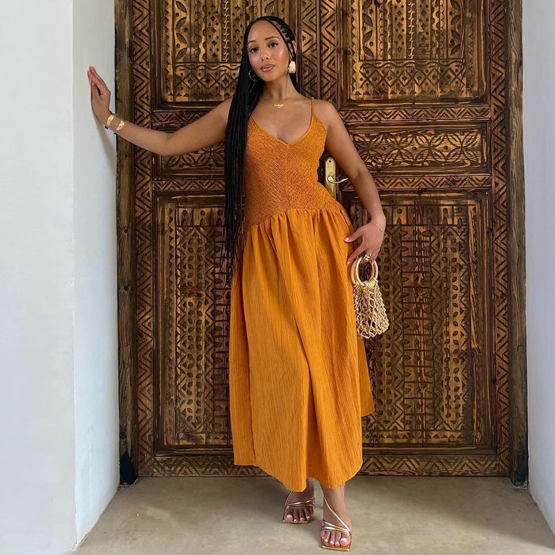 Summer New Elegant V-neck Stitching Mid-Length Solid Color Sleeveless Sling Dress