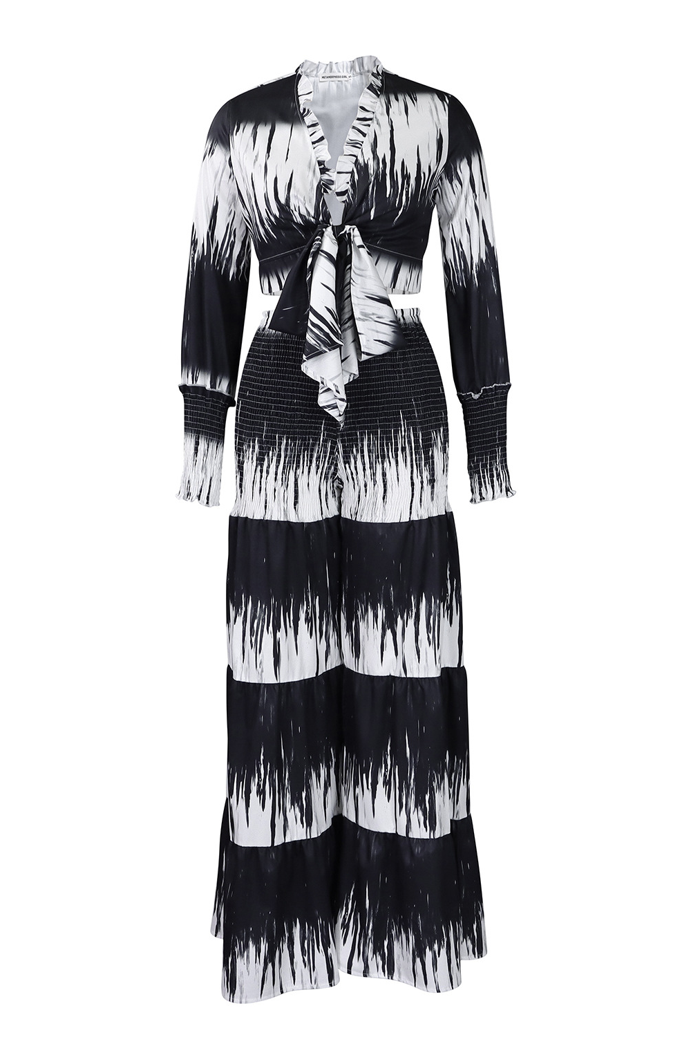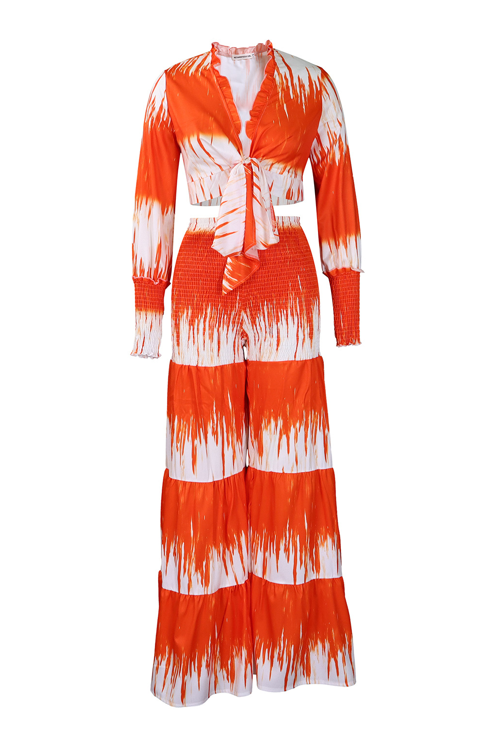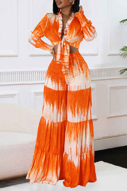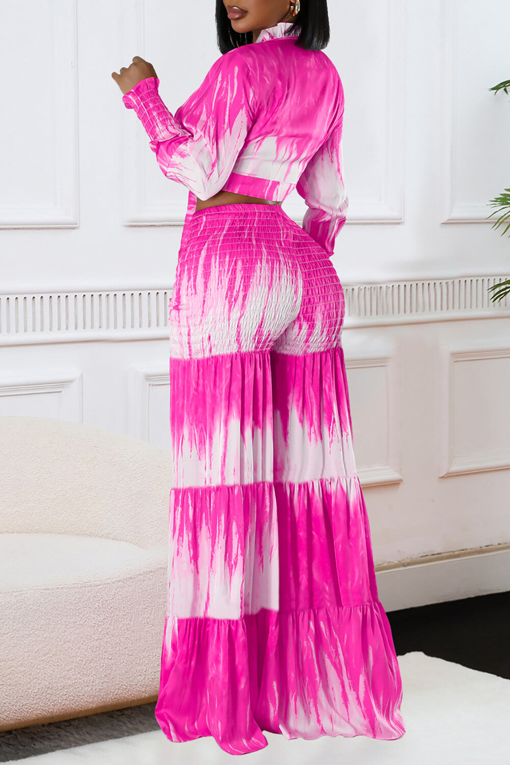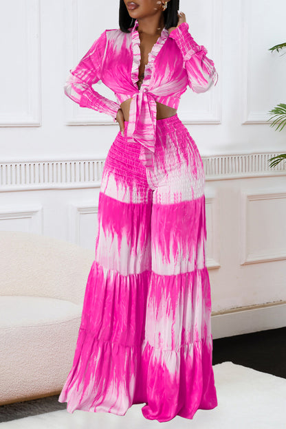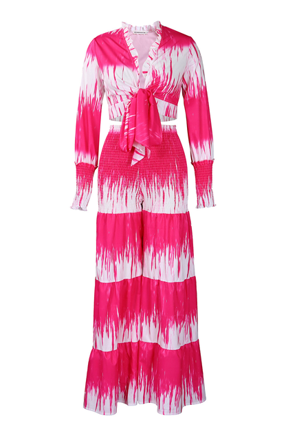 Tie Dye Print Long Sleeve Tie Up Blouse Wide Leg Pants 2pcs Set-Fuchsia