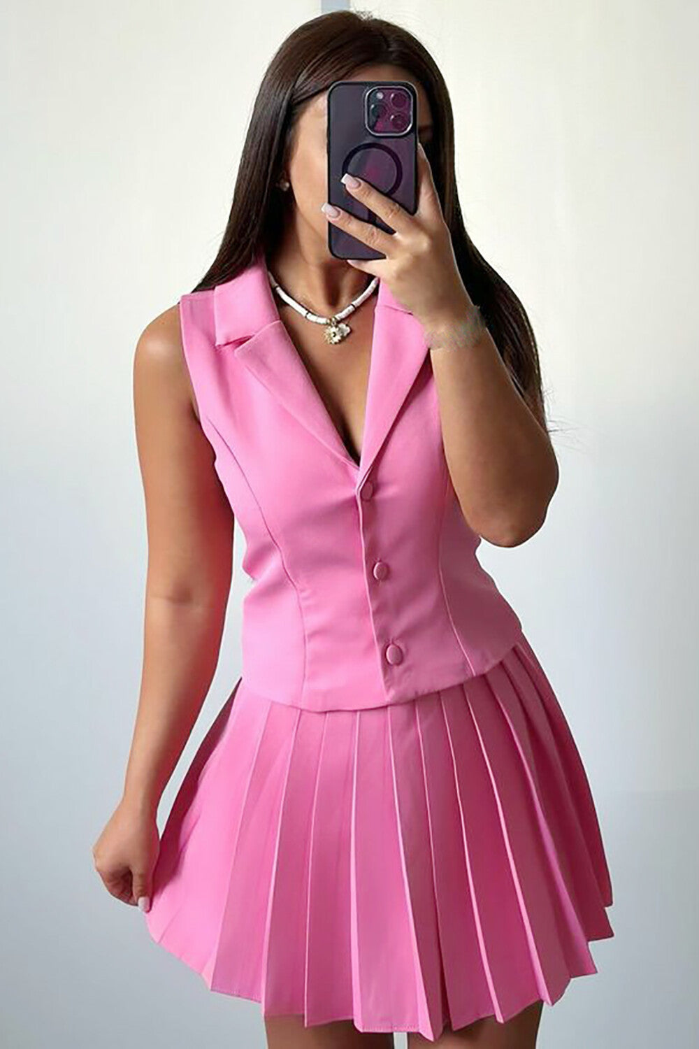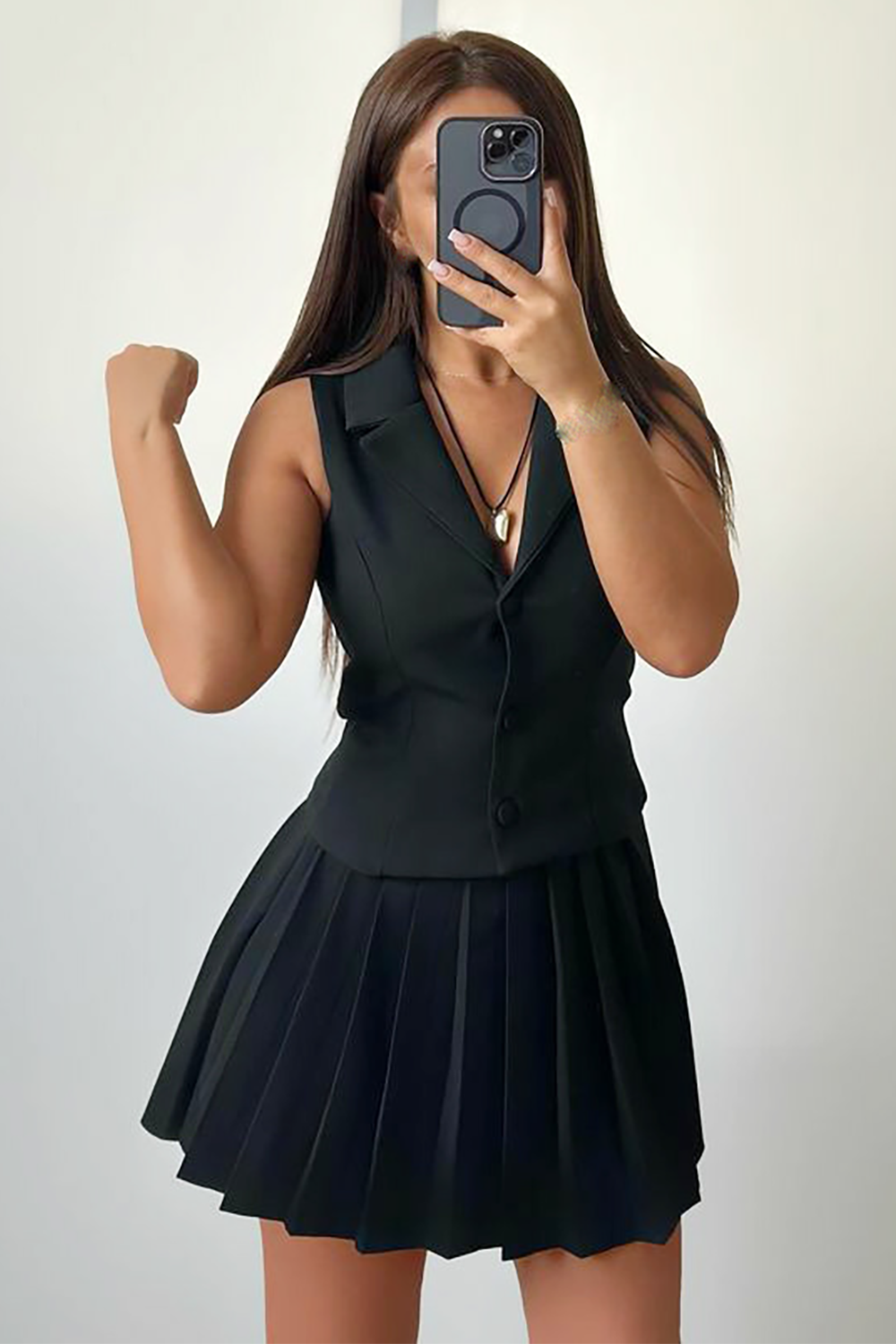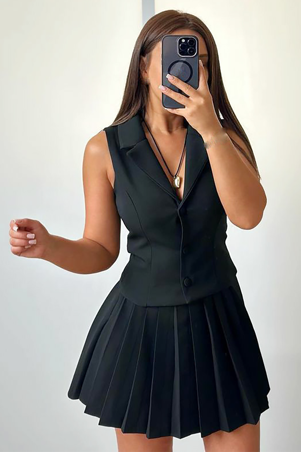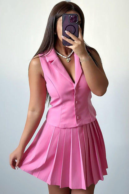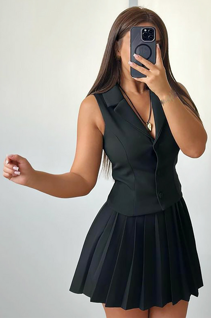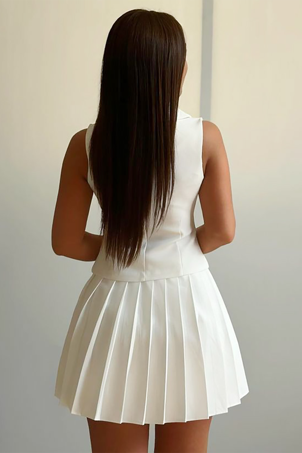 V Neck Button Up Vest Solid Color Pleated Mini Skirt 2pcs Set-White