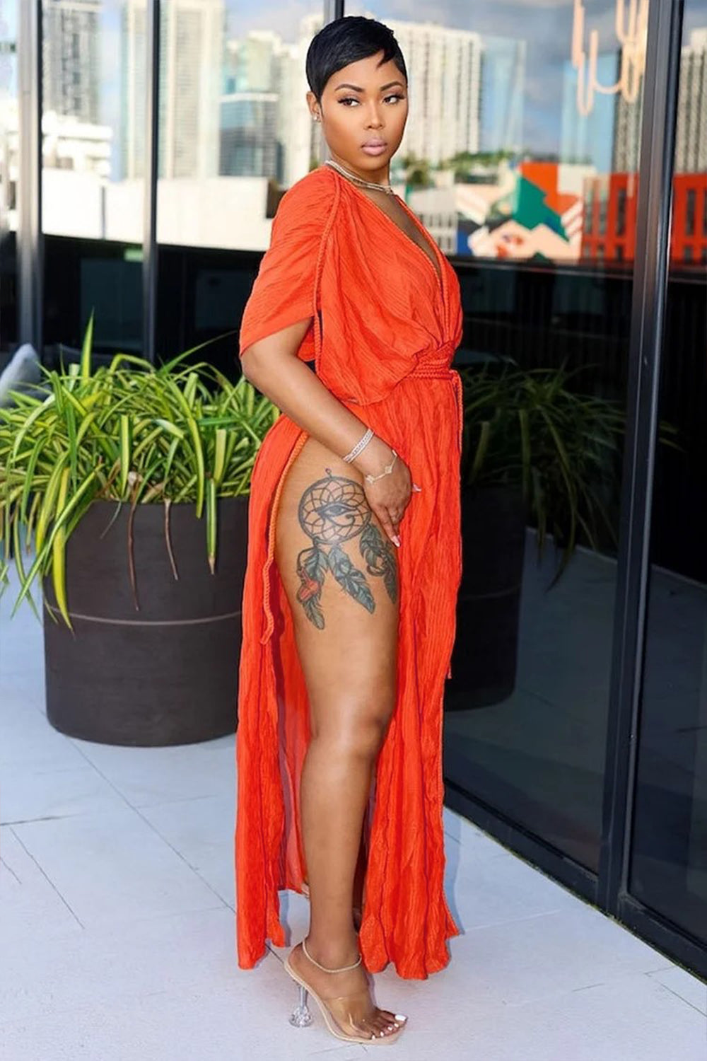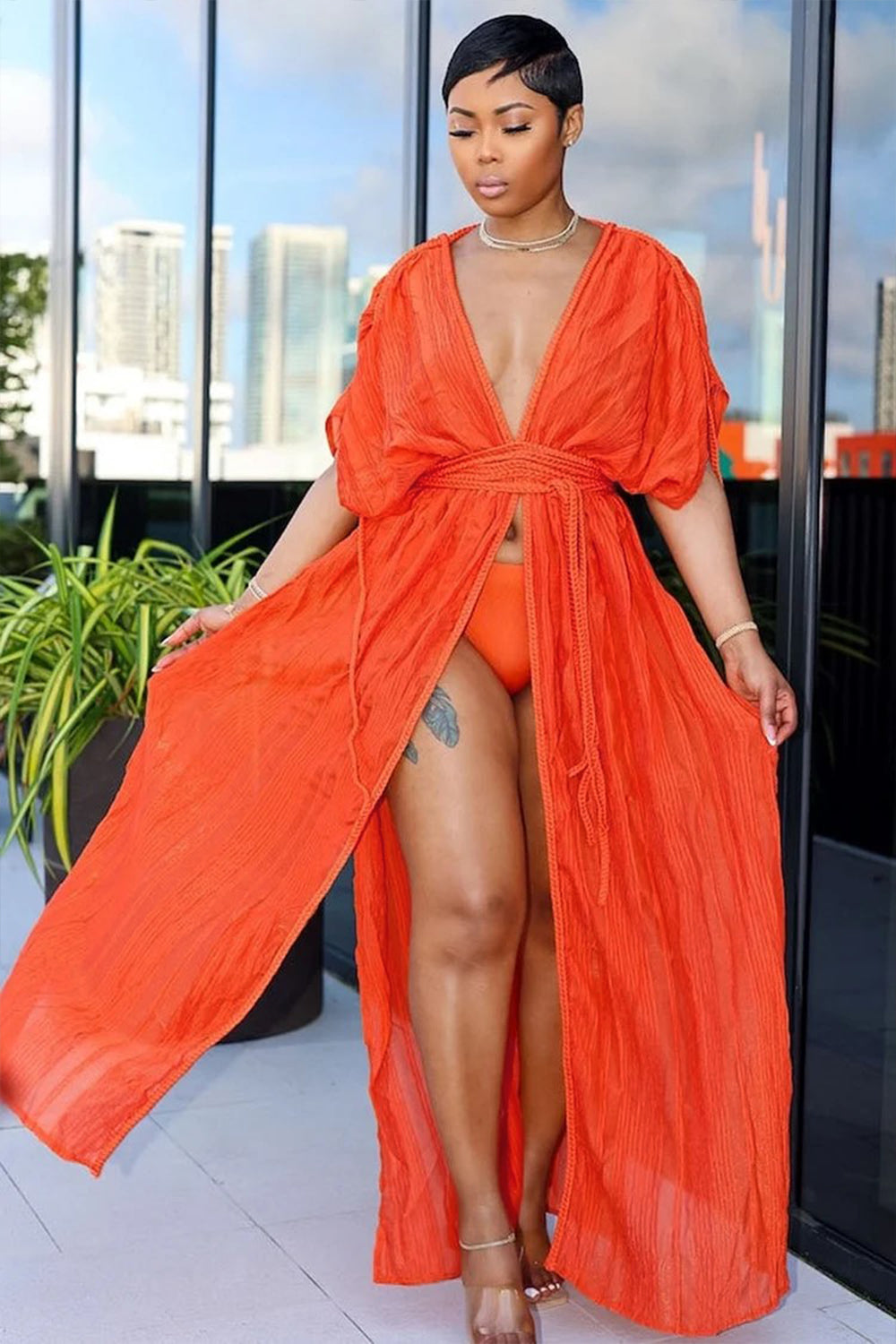V Neck Ruched Sleeve Slit Vacation Coverup Maxi Dresses-Orange