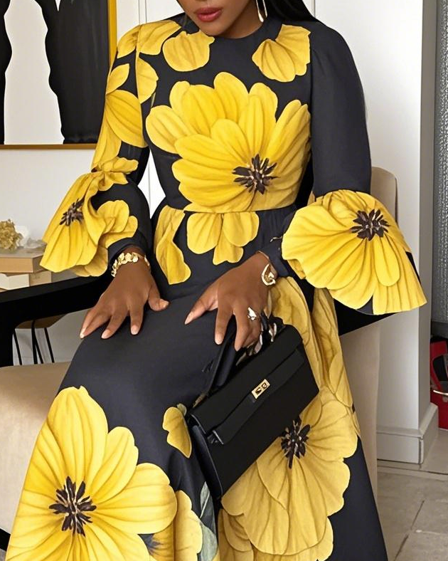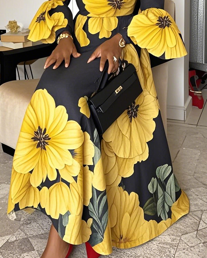 Women Fashion Elegant Formal Round Neck 3/4 Sleeves Floral Pattern Maxi Dress