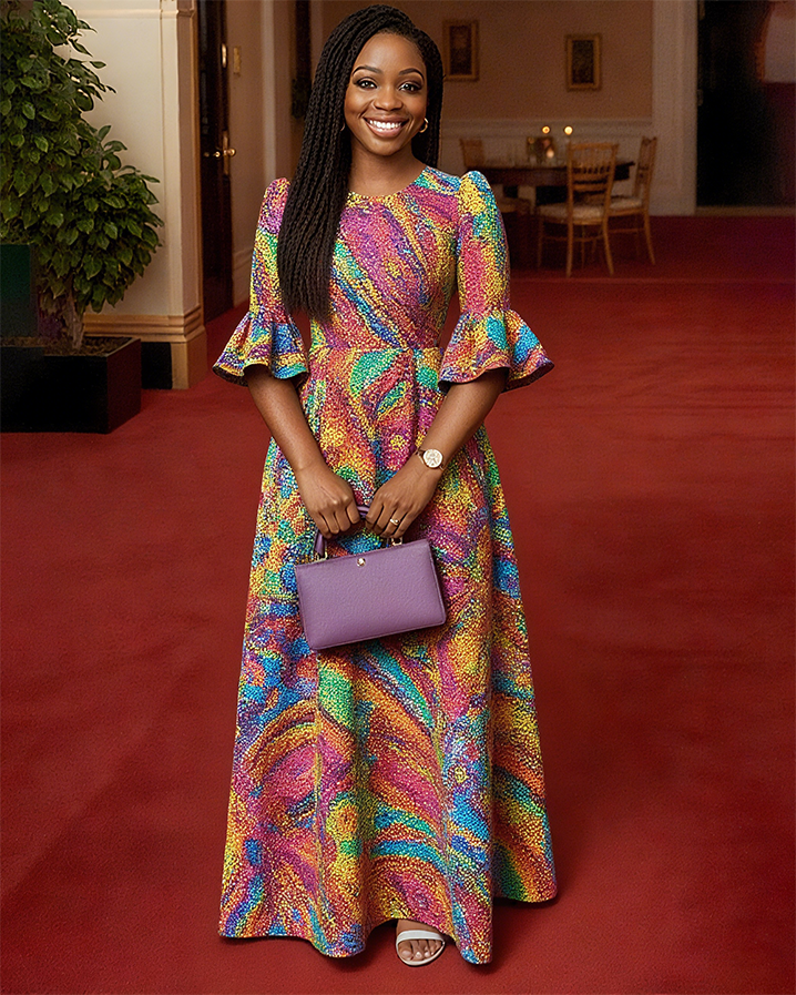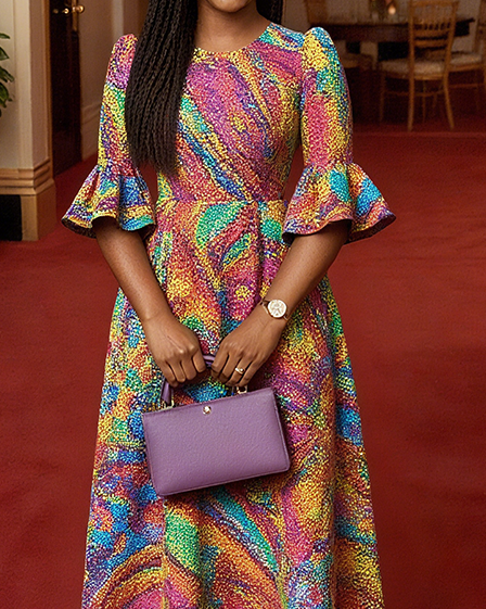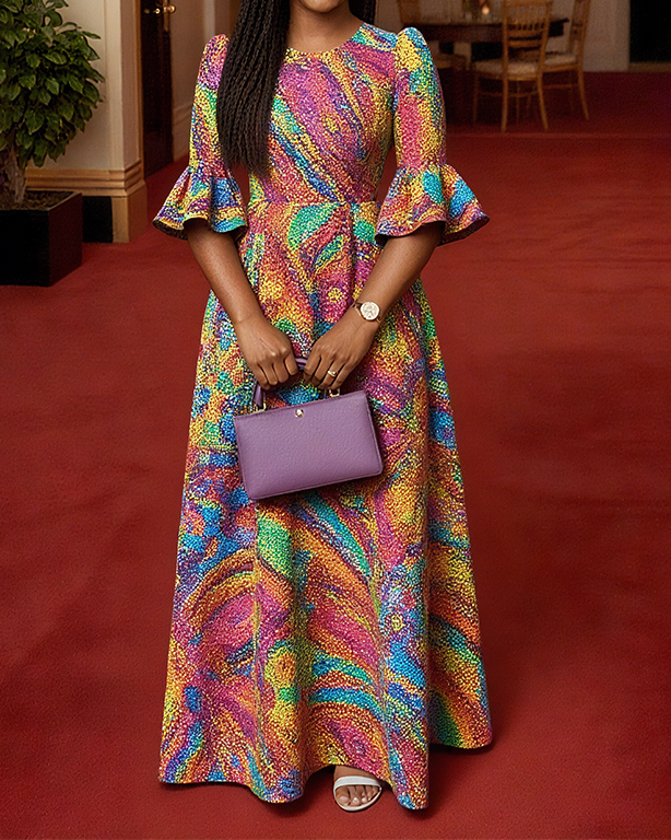 Women Fashion Elegant Formal Round Neck 3/4 Sleeves Pattern Maxi Dress