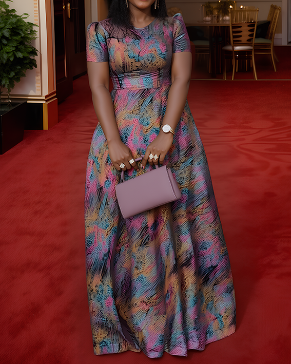 Women's Summer Elegant Gorgeous Printed Lace Round Neck Short Sleeve A-Line Maxi Dress