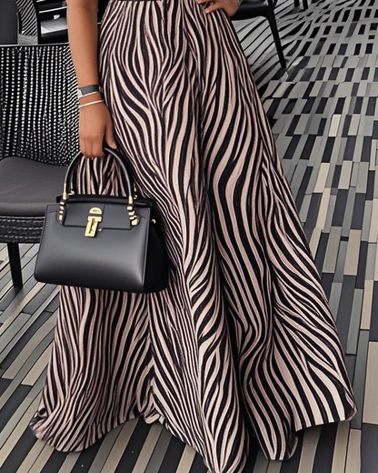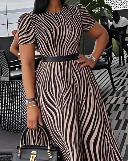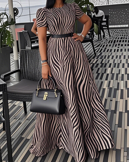 Women's Summer Elegant Round Neck Short Sleeve Zebra Pattern Print Slim Waist A-Line Maxi Dress(Without Belt)